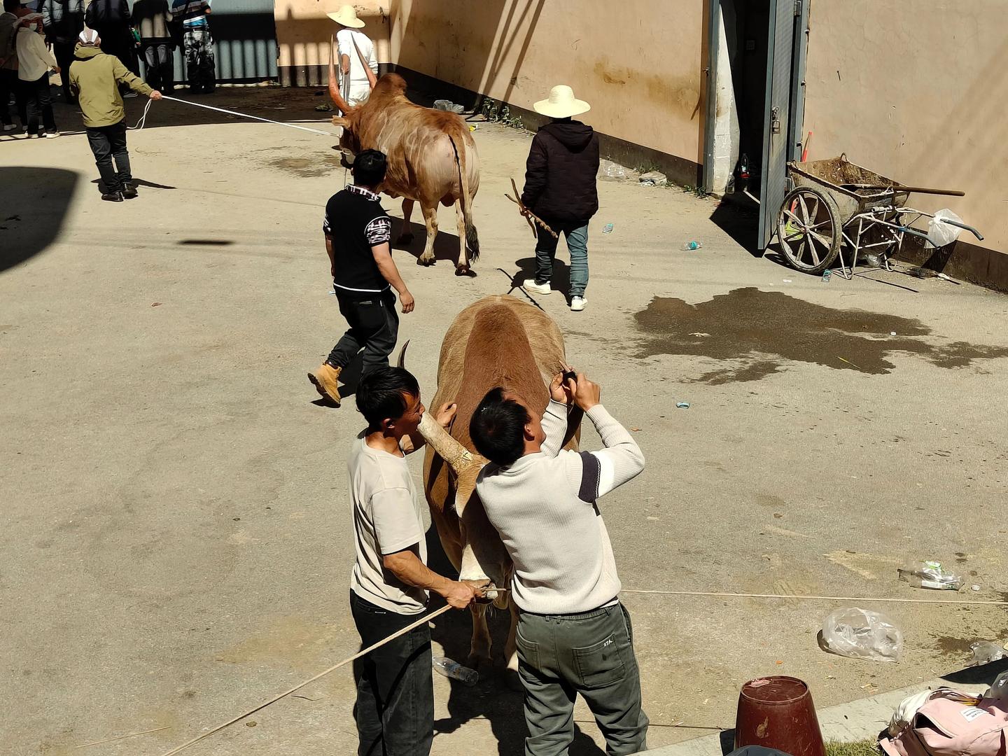 西班牙是人斗牛,我们这边是牛打架,纯粹的力量的比拼,确实也是够震撼的,不过苗族这边用的斗牛,和我在黔桂见到的不一样,那边一般用水牛,这边的话,改成了用高峰牛,感觉是更加的健壮,更加的有力。不过看上图,比赛的牛在磨牛角,估计场面方面会有点血腥。