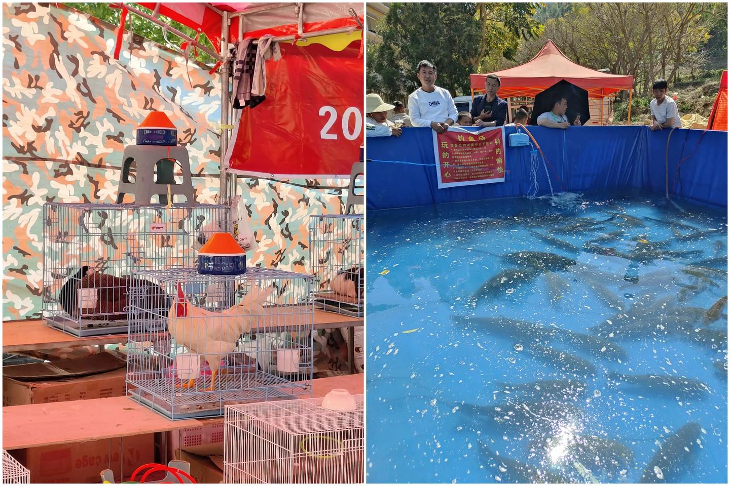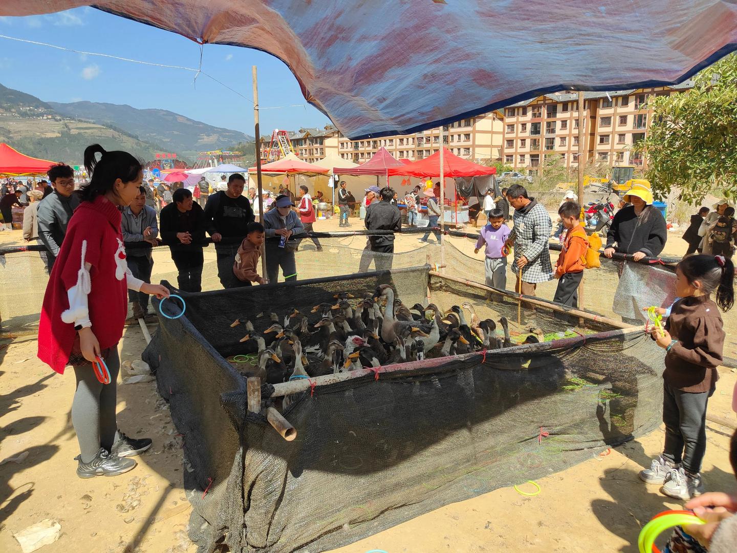先说玩的吧,各种套圈,奖品也是接地气,鸡鸭鹅鱼。连孔雀都齐全了,套圈还看到有电瓶车,一天下来 技术高的绝对能开个电瓶车把食物带回家。