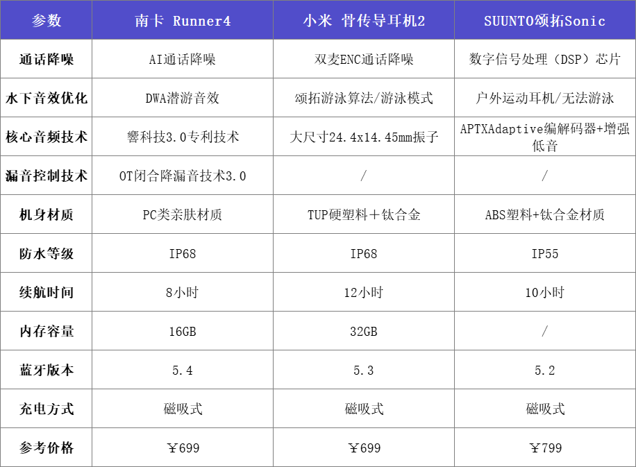 通过对南卡 Runner 4、小米骨传导耳机 2 和 SUUNTO 颂拓 Sonic 的全维度测评,可以清晰看到三者在定位和表现上的差异。