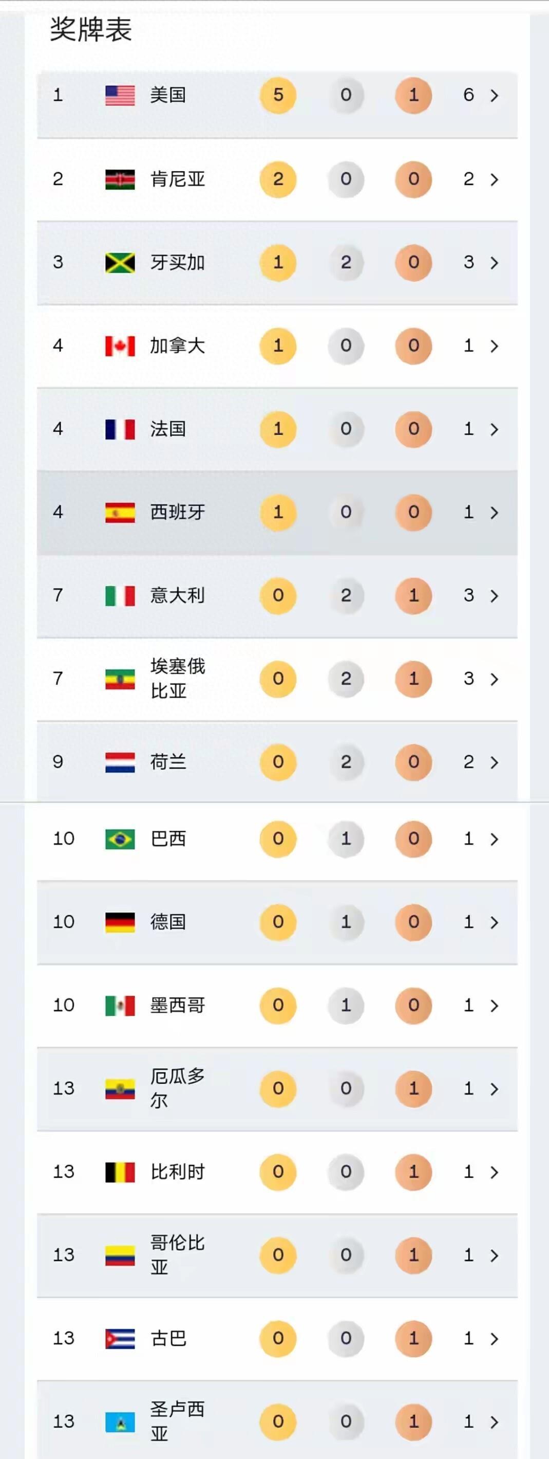 至此,赵杰、张家乐两人也打破了中国队在今年世锦赛奖牌零的突破。在最新金牌榜上,美国以5金1铜排名第一;肯尼亚以2金排名第二;牙买加以1金2银排名第三;第四是加拿大、法国、西班牙都是1金。