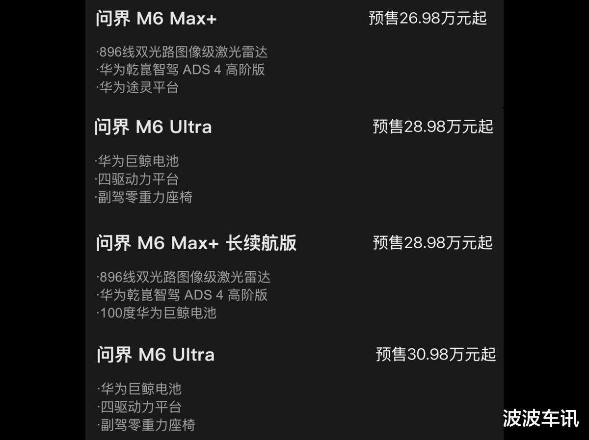 新车的内饰给人一种很新鲜的感觉,很有欧式意味儿,整个中控台采用的是很严谨的效果,副驾一侧也有大屏,中间采用了悬浮式的大屏,方向盘的造型也很时尚。新车的中控台还采用双拼颜色,看起来也比较运动化。在配置方面,新车标配896线激光雷达,还有冰箱、小桌板、吸顶屏等配置。动力方面,增程版和纯电版均采用双电机,前后电机最大输出功率分别为160kW和180kW,增程版车型采用的是1.5T发动机作为增程器,纯电续航有180km、260km、272km三种规格。问界M6纯电版车型采用的是100kWh电池,它的纯电续航有665km、705km、715km、760km四种规格。