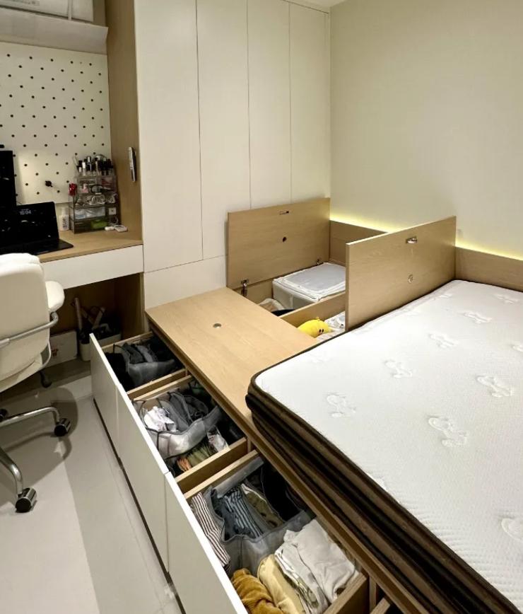 1)侧面抽屉:放弃箱体收纳,只做侧面“深抽收纳”,以此提升收纳便捷性。需要注意的是,房间得满足深抽拉出来的空间,以及抽屉底部需要安装万向轮提升支撑力和灵活性。