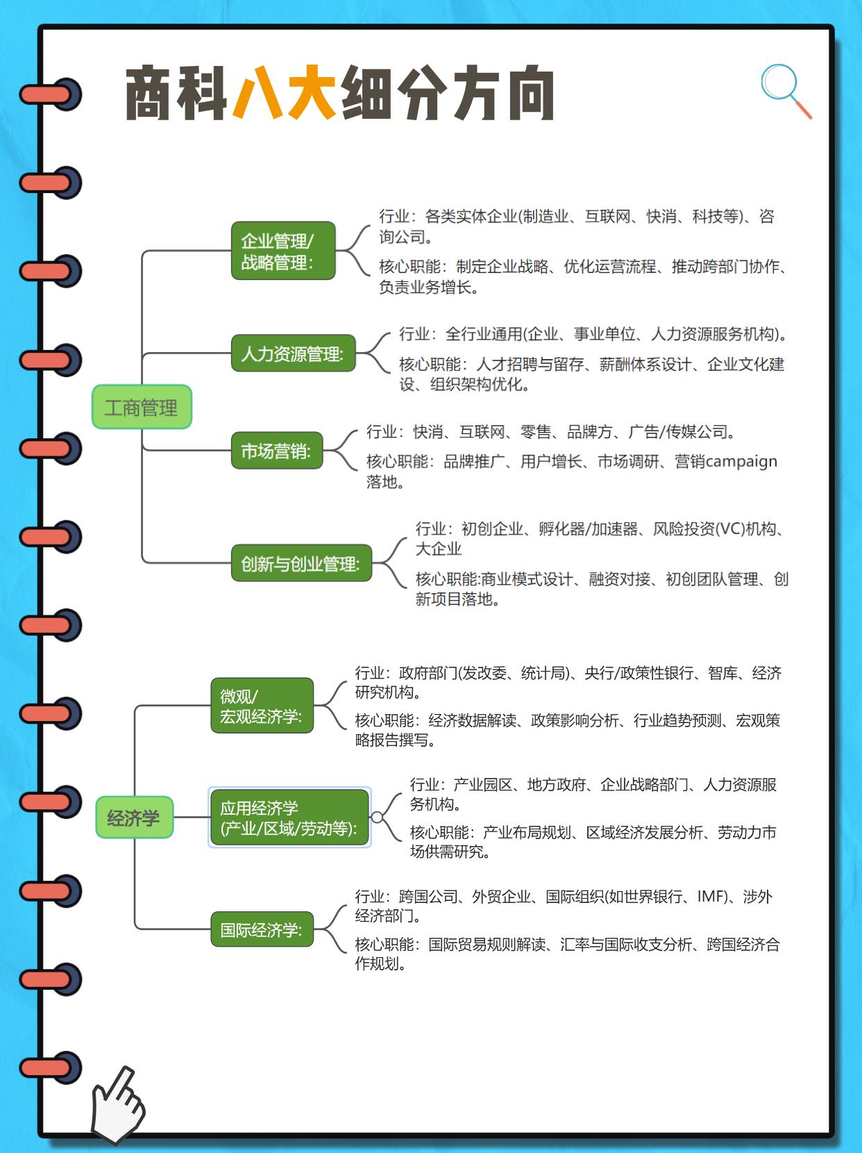 工商管理:可细分为企业管理战略管理、人力资源管理、市场营销、创新与创业管理;