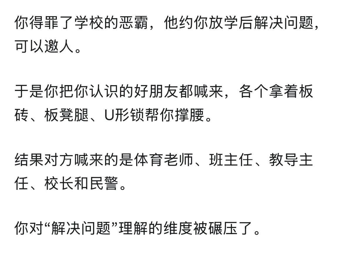 想起来初中那会,班里有个恶霸欺负同学,想午休时间揍他一顿,结果那位同学直接叫来了恶霸他爹,好好收拾了一顿,从此恶霸从良了,毕竟他爹就在学校门口卖猪肉!