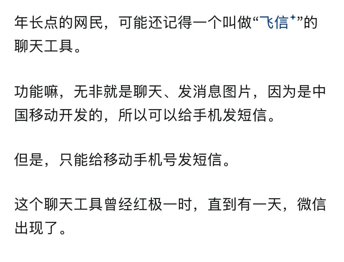 笔者还记得14年上大学那会,一坐上迎新生的车,就注册上了飞信,当年真可谓是红极一时,现在呢,估计没几个人用飞信了吧!值得一提的是,微信流行起来以后,飞信的应对措施是开始收费,这种操作世间罕见!