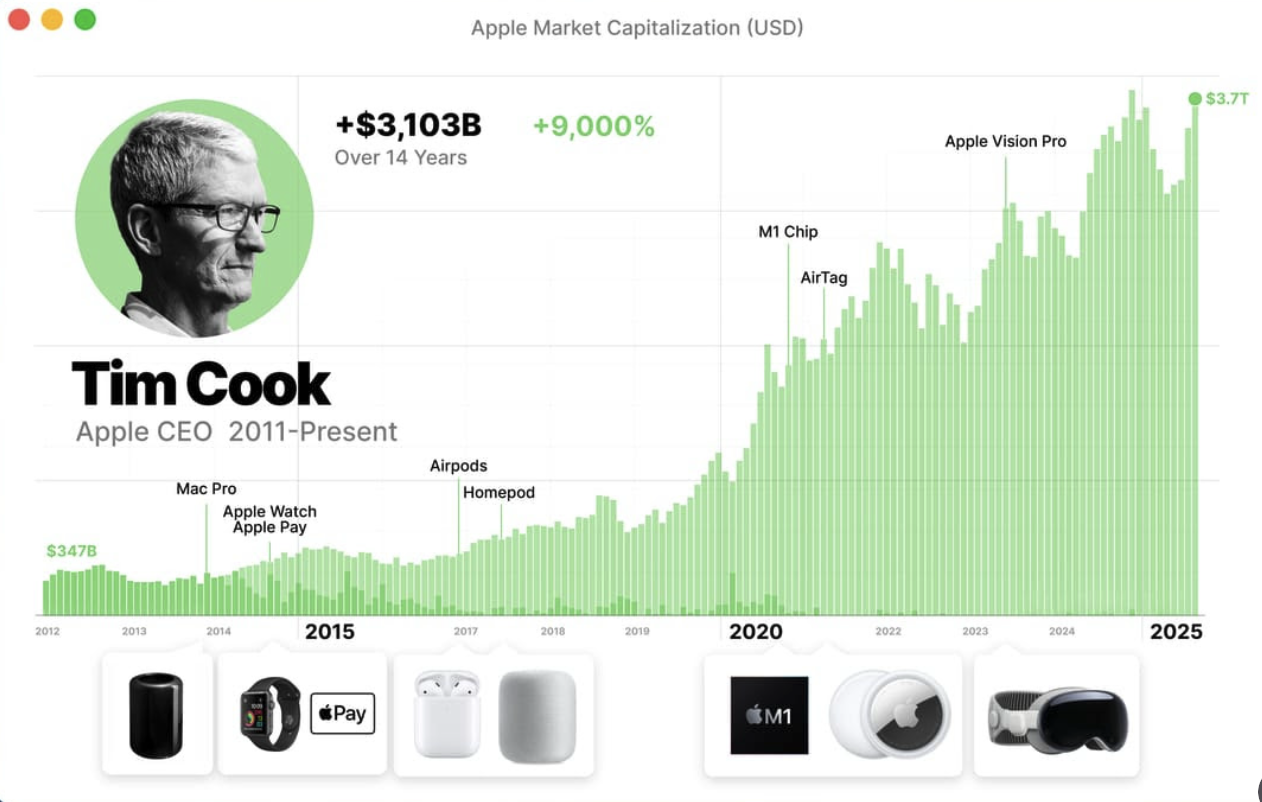 2011年10月,乔布斯去世;随后库克正式接管苹果帝国,截至目前,正好做了14年的CEO;