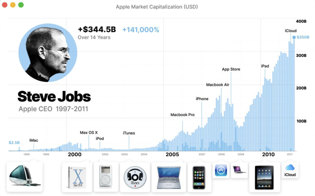 乔布斯时代(1997-2011),让苹果从濒临破产的2.5亿美元市值起步,到iMac、iPod、iPhone和iPad这些神级产品登场,苹果完美演绎了什么时“凤凰涅槃”,市值达到3445亿美元,增长率高达141,000%。