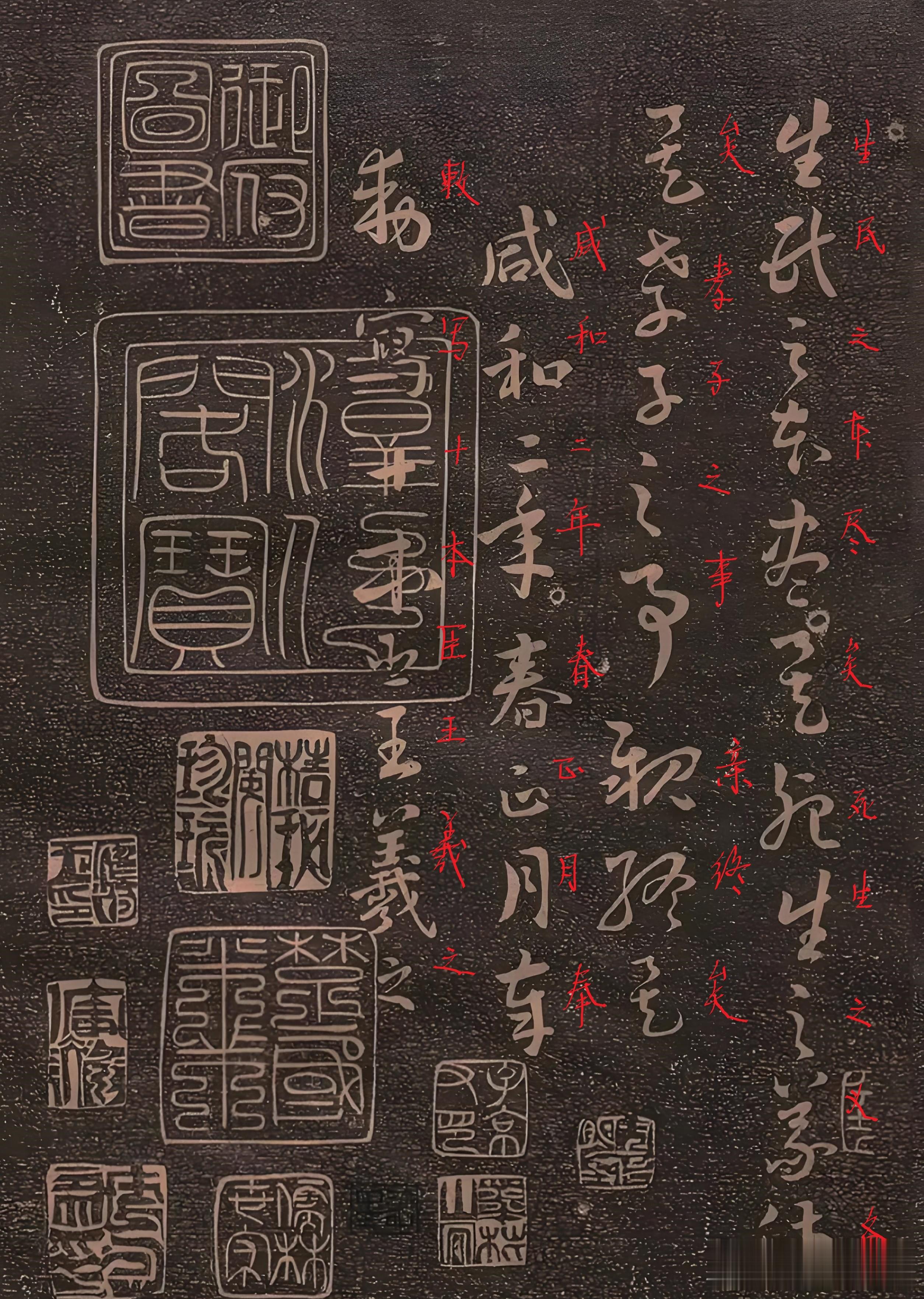 其笔法中锋沉厚,藏露互见,提按间具 “锥画沙” 之劲;结构欹正相生,“之” 字多变,尽显中庸灵动;章法行气贯通,疏密随文气起伏,庄重不失飘逸。米芾誉其 “行草极则”,与《兰亭序》一雅一庄,共为书坛典范。