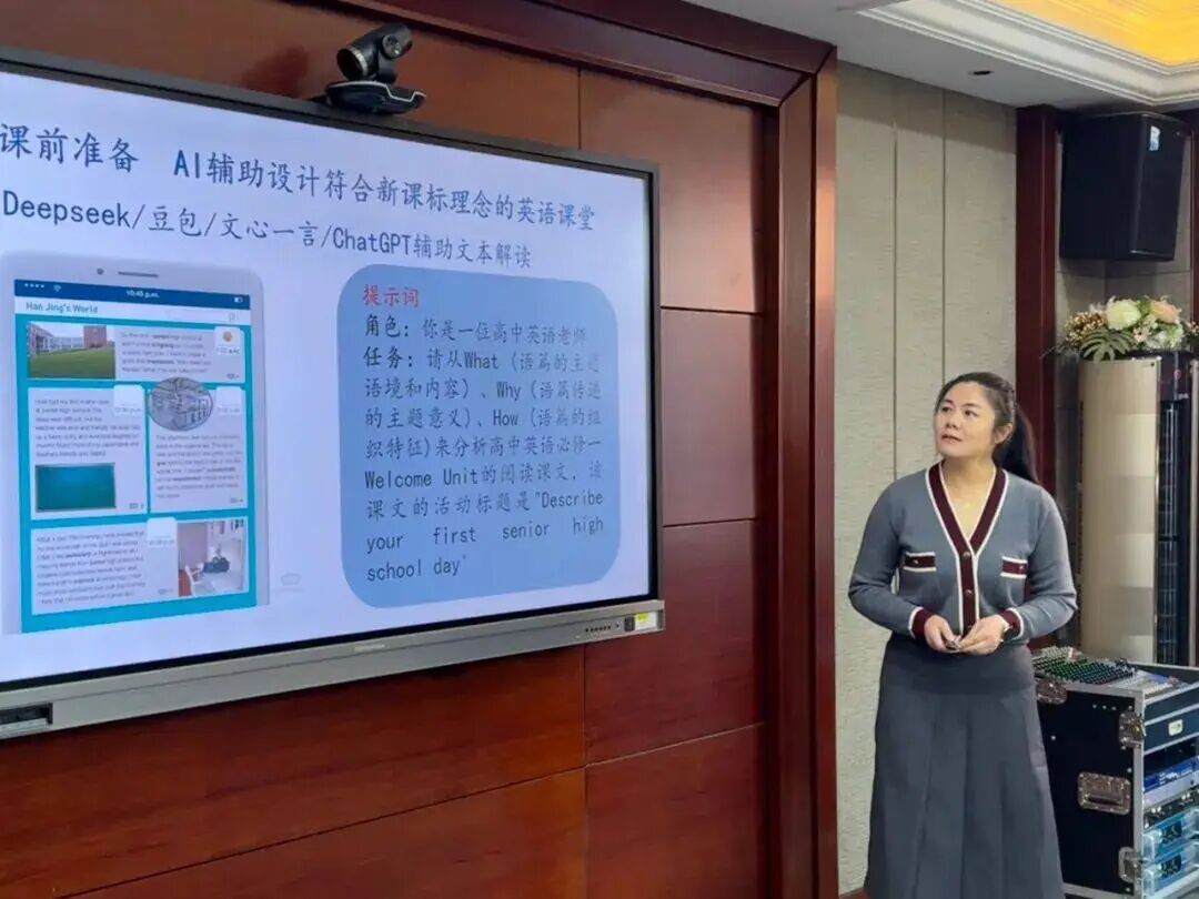 关晓菲老师则将目光投向语法教学的痛点破解,分享了“AI赋能语法课堂”的创新策略。针对语法学习枯燥、学生参与度不高的问题,关老师提出借助AI拆解语法知识、剪辑影视剧台词视频,用趣味化形式降低学习门槛;通过AI生成分层梯度练习题,满足不同学生的学习需求;更能检索近三年高考真题,精准定位语法知识点的考查方向。她以实例向大家展示了如何在语境中讲解语法规则,引导学生在场景应用中增强语法使用感,让语法学习真正“活”起来。