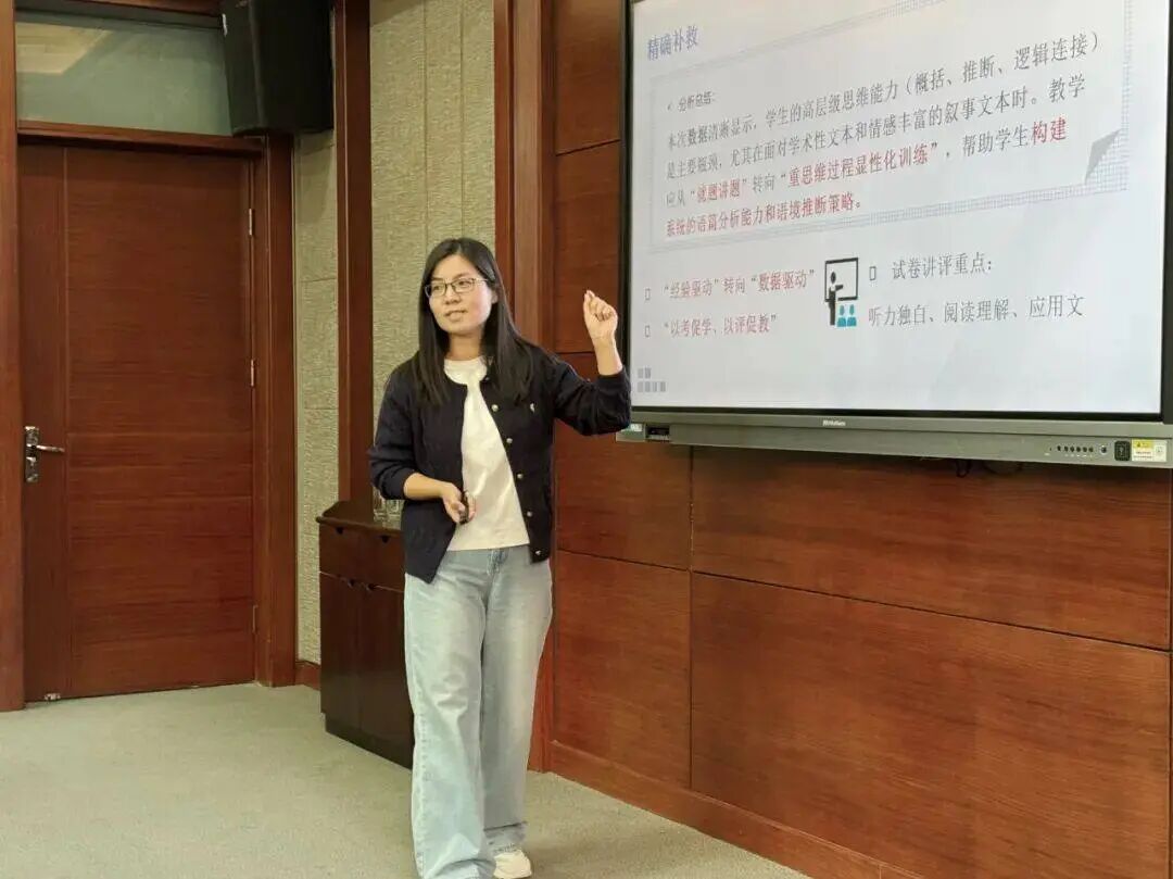 许彩敏老师的分享聚焦于“AI在试卷讲解中的实践应用”。利用AI对智学网的成绩数据进行深度分析,能够精准定位学生的知识薄弱点;在说明文讲解中,通过“情景化—去情境化—再情景化”的三步法,帮助学生梳理文本的结构、背景、实验与结论。AI助力学生实现从“漫游式阅读”到“导航式阅读”的转变,让阅读更具方向性;同时,借助AI生成写作错误自查表,帮助学生在纠错过程中掌握正确表达,有效解决写作内容空洞、逻辑脱节的问题,真正实现“小战场练习大本领,从一堆问题到一幅蓝图”。