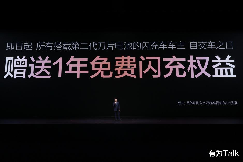 发布会现场,王传福还宣布:所有搭载第二代刀片电池的闪充车车主,均享有重磅“闪充权益”,自交车之日起,在全国闪充站可享受1年的免费闪充权益,让闪充体验更畅快。并且,在闪充免费期结束后,也会同行业保持一致,不会额外收费。
