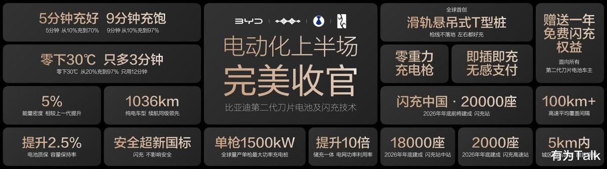 第二代刀片电池及闪充技术的发布,与“闪充中国”战略的落地,标志着 “充电慢”、“低温充电难”这两大世界性难题已被攻克,新能源汽车电动化的“上半场”至此完美收官。