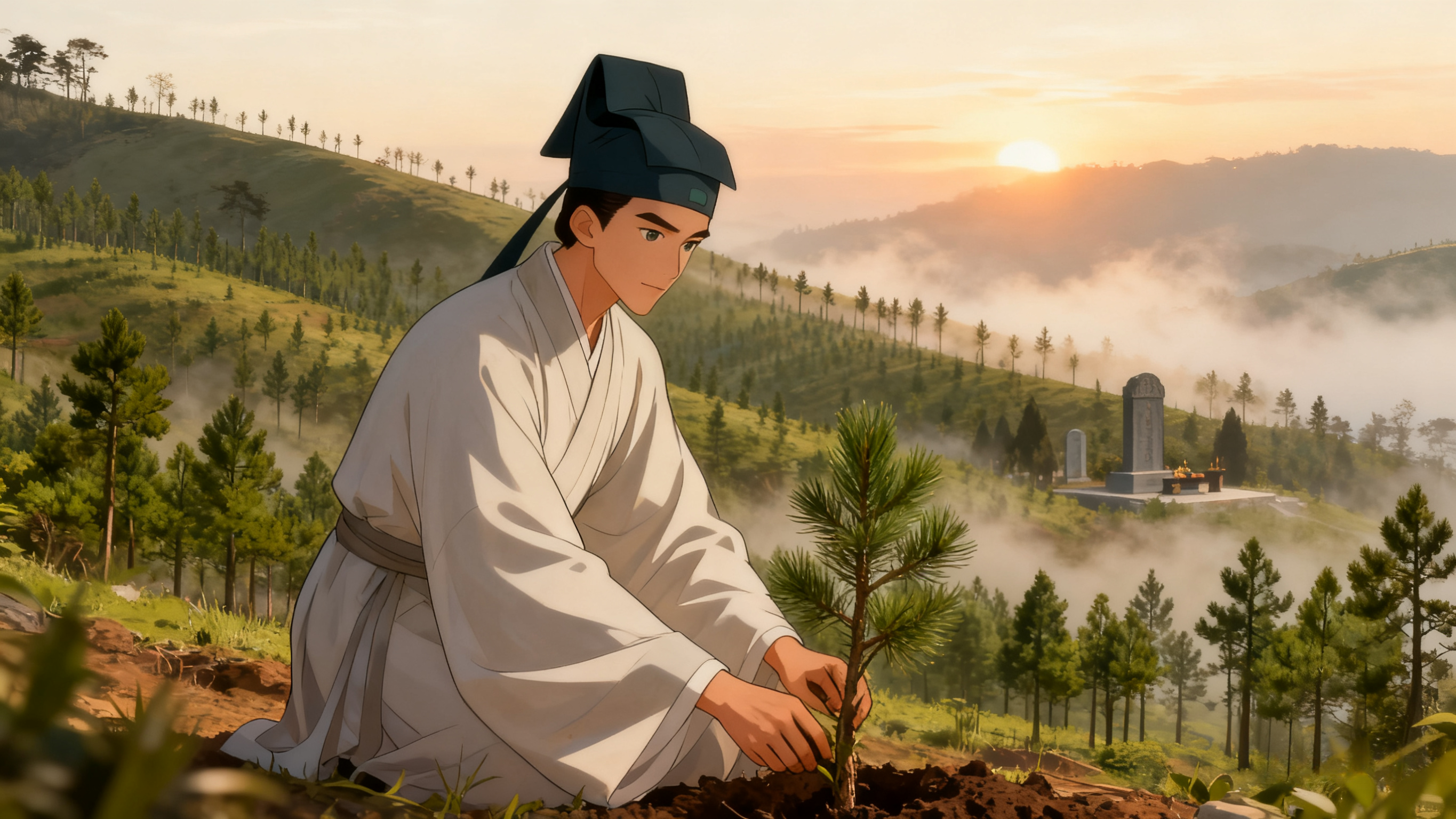 他在墓前种下三万棵松树。每一棵,都是他对亡妻的思念。