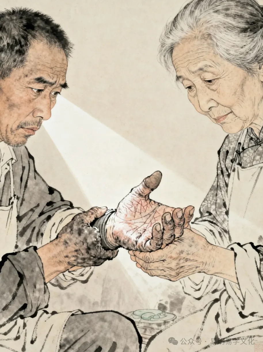 外婆没接话,抓起那块崩了的籽料。玉是凉的,贴在手上像块冰。她翻来覆去地看,指甲抠了抠崩口:“这玉不是死的,是活的。你爹传你的不是块石头,是磨玉的性子。你听听,它在你手里喊疼呢!” 她把周石匠的手拽到亮处,阳光照在他乱蓬蓬的掌纹上。“你看你这掌纹,乱得像没理清楚的玉丝。可指节上的伤是实的——伤在指,是匠人的印;玉崩了,是手艺在跟你喊停!”外公从药箱里掏出个陶罐,倒出些深绿色的药膏,一股松节油的味飘出来:“先治伤,再治心。这药膏你磨玉时就敷着,伤能长好,气味还能让你脑子清醒。”他用竹片把药膏抹在周石匠肿胀的指节上,“你娘说你三天没磨玉了?从今天起,别雕大件,就磨玉牌——把玉磨得比镜子亮,你的心就跟着亮了。”