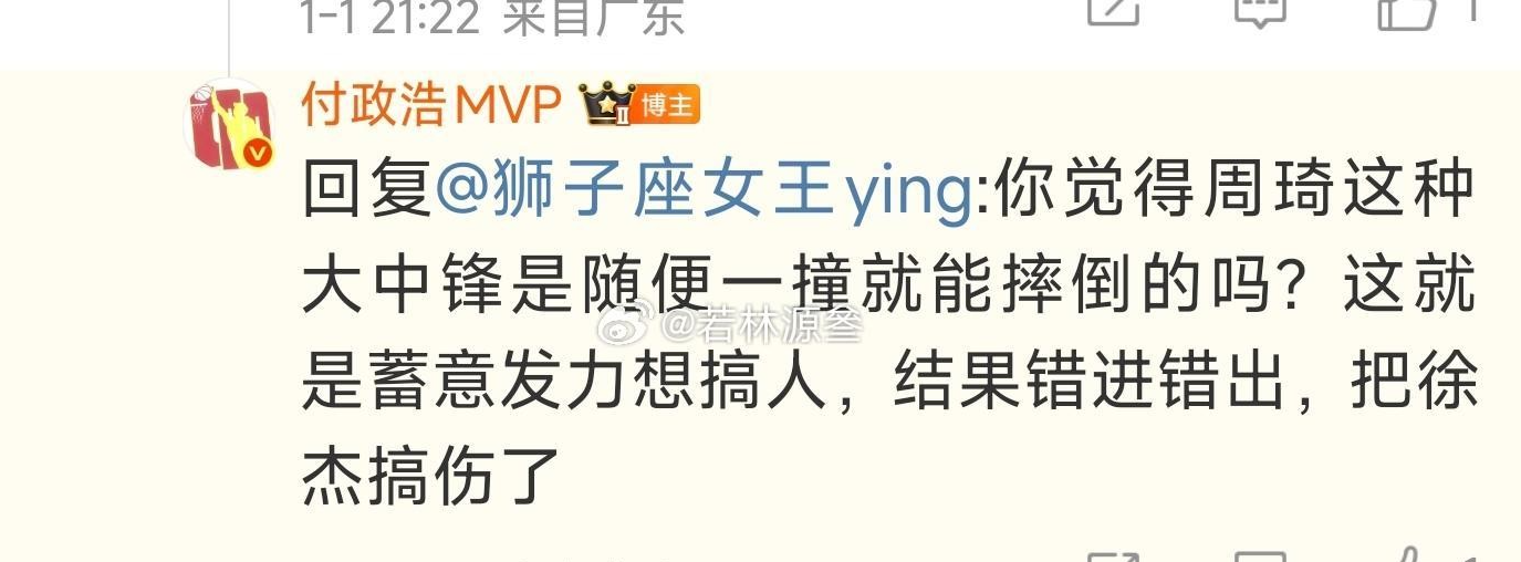 山西篮讯认为,周琦倒地误伤徐杰只是突发,周琦被绊被推倒地,寻求的是自我保护,故意报复广东徐杰的成分不大,个别球迷不要以讹传讹,更不要按照自己的主观臆断编造这种可能激化矛盾的导向性舆论。无论如何,年末最后一天萨姆纳过生日,头一天徐杰受伤,这种乐极生悲的事情谁也不愿看到。