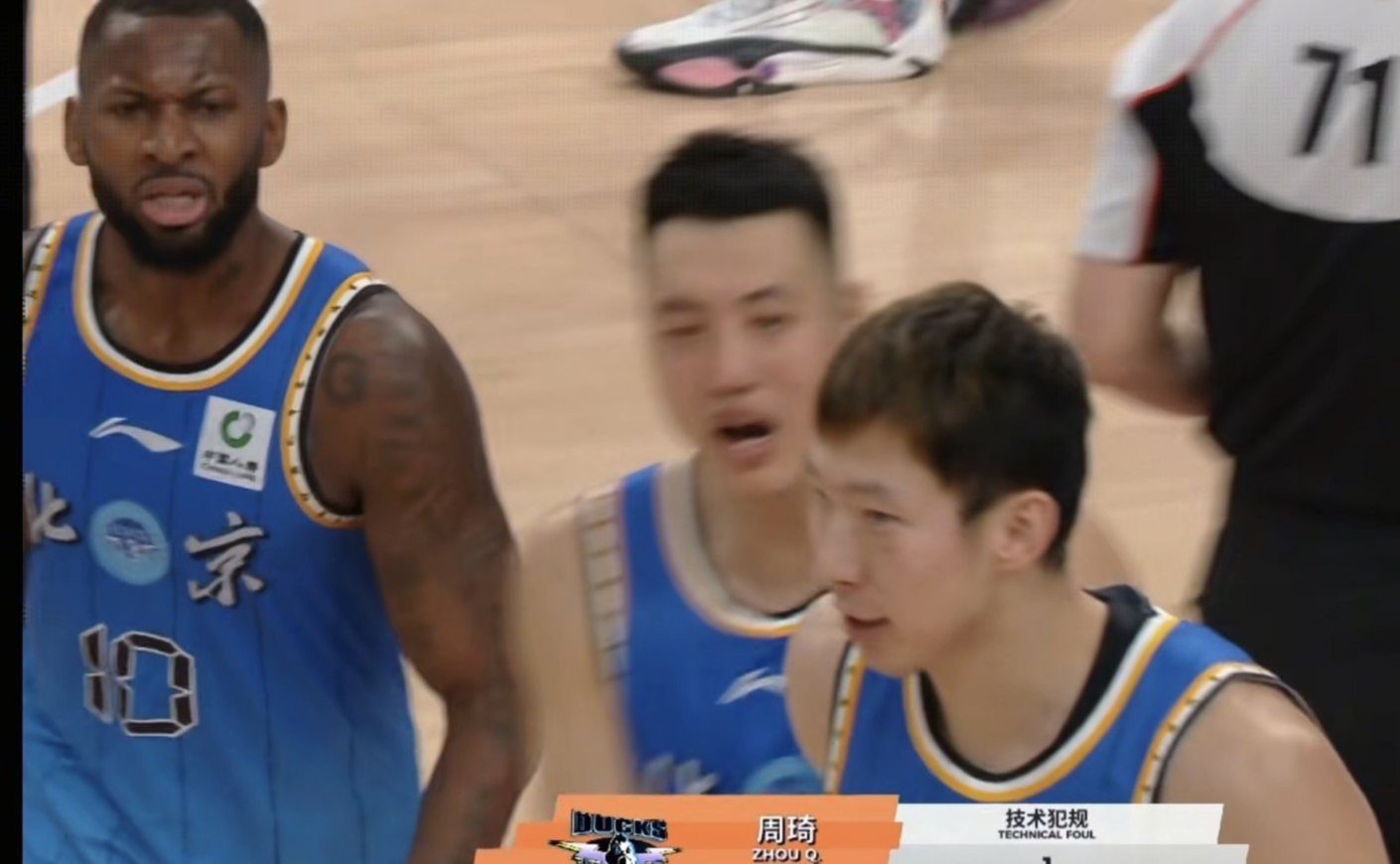 周琦吃到技术犯规后,大有不甘休之势,继续给裁判施加压力,甚至摘掉眼镜护具前去与裁判分辩,自己显示出即使被罚下也要说理的明显倾向,直至被队友拉开,裁判假装和赵睿沟通而放过了周琦。