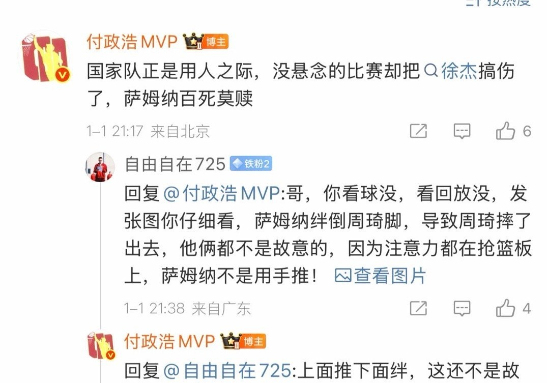 广东媒体人付政浩认为,萨姆纳“上面推,下面绊”导致周琦倒地伤及徐杰,与大多数球迷认定的“萨姆纳是原罪”同工异曲。但有球迷不认同这个观点,他们认为:“你觉得周琦这种大中锋是随便一撞就能摔倒的吗?这就是蓄意发力想搞人,结果错进错出,把徐杰搞伤了”。