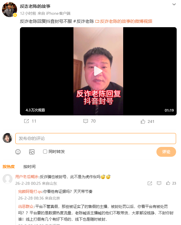 对此,反诈老陈在微博发布视频回应,明确表示不服其处罚定性。他称封号早有心理准备,但不认可平台给出的违规认定,强调自己打假只是行使消费者监督权、为公众发声。他表示,抖音并非执法部门,平台公告内容侵犯名誉权,并将起诉抖音,通过法律途径维权、还原清白。