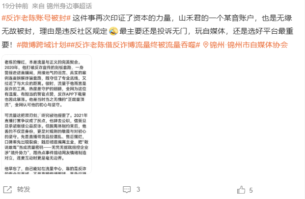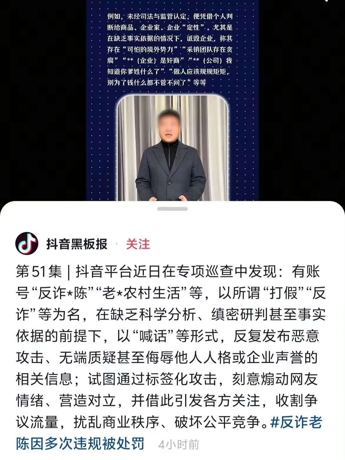 PChome获悉,抖音在公告中明确,“反诈老陈”以打假、反诈为名义,在缺乏事实依据与科学研判的情况下,长期以“喊话”形式发布恶意攻击、无端质疑内容,擅自给企业与个人定性,散布不实言论、侮辱人格与企业声誉,并通过标签化攻击、刻意煽动网友对立,借此收割争议流量。平台此前已多次采取限流等处罚手段,但其持续违规,最终予以封禁。