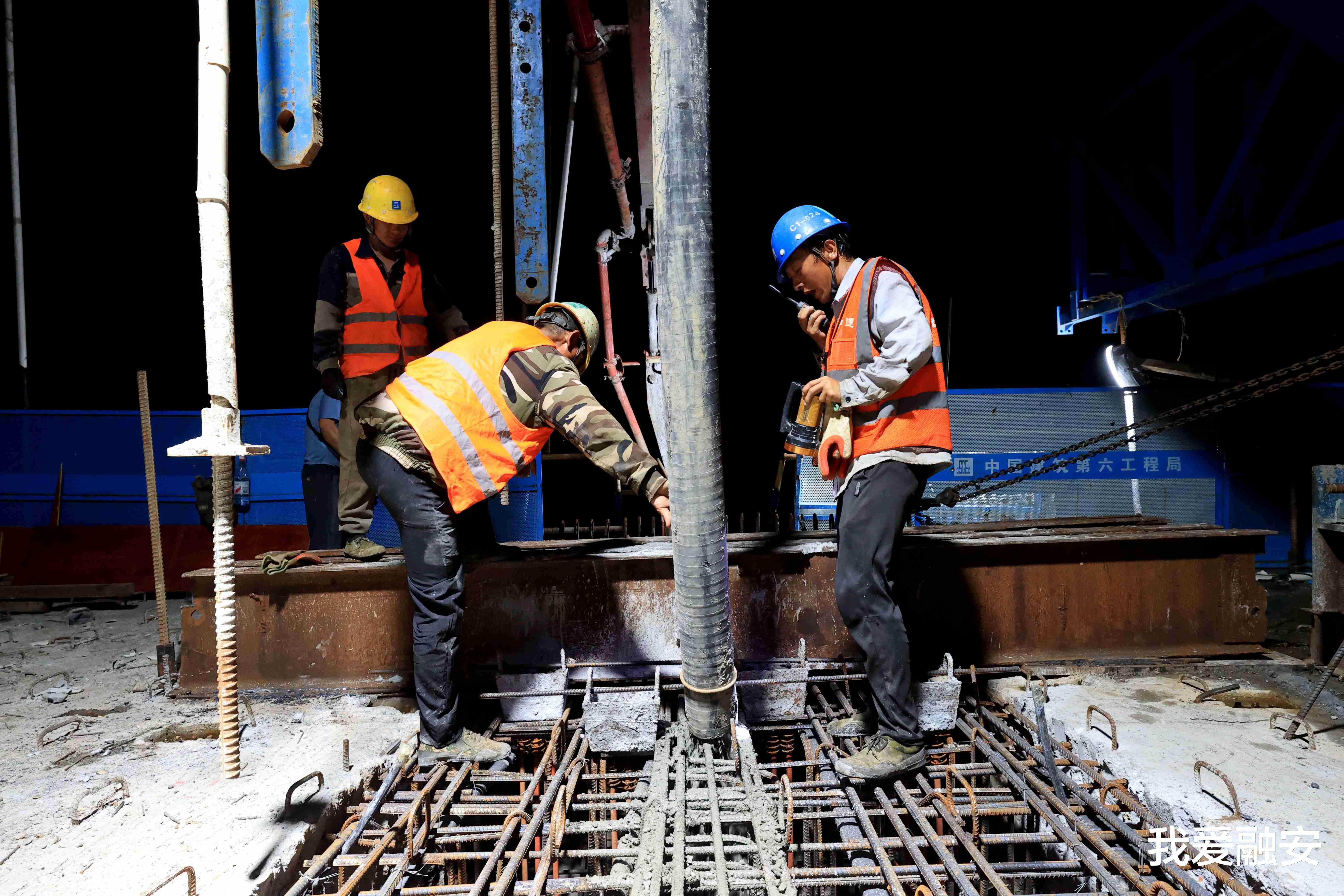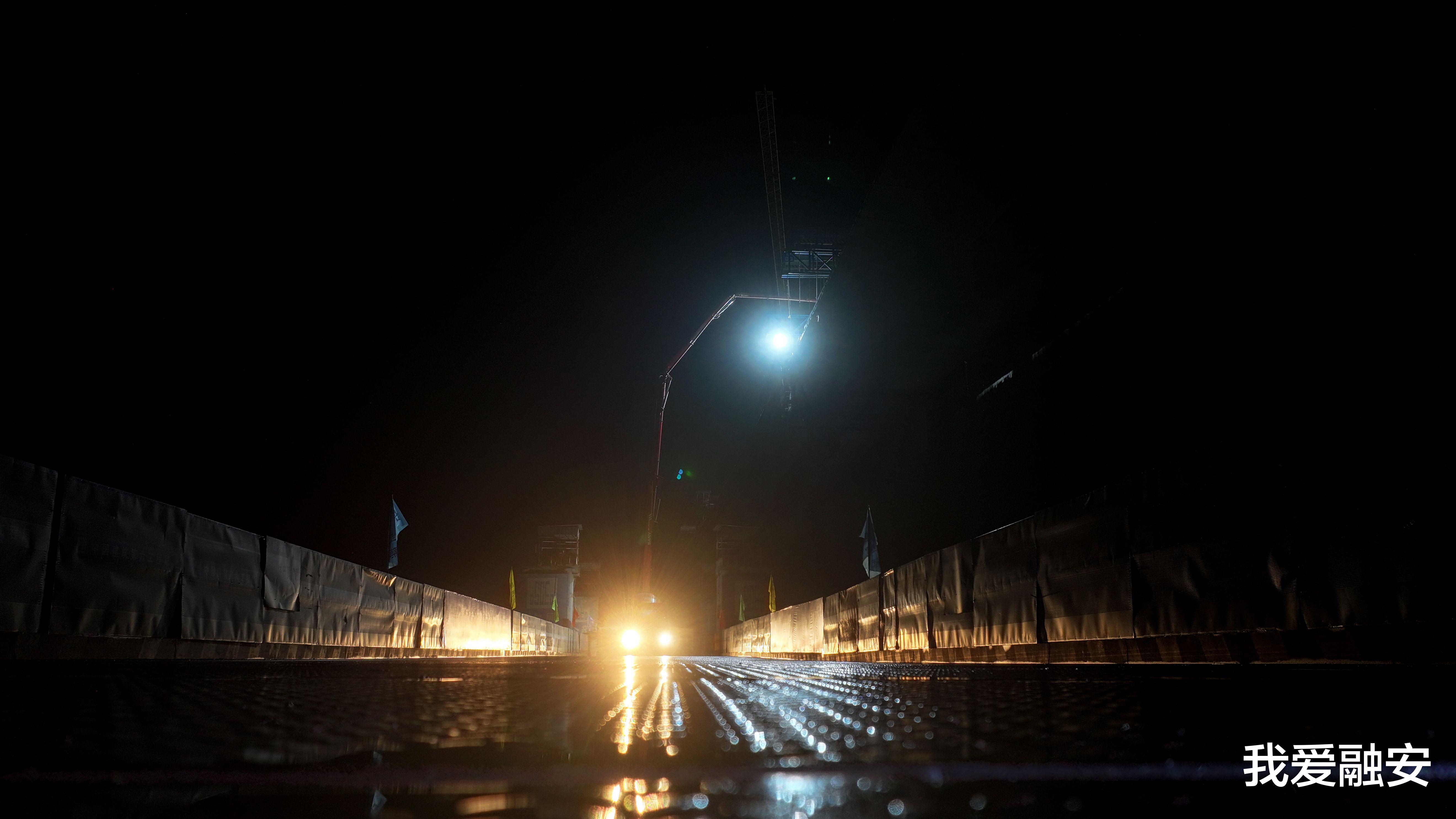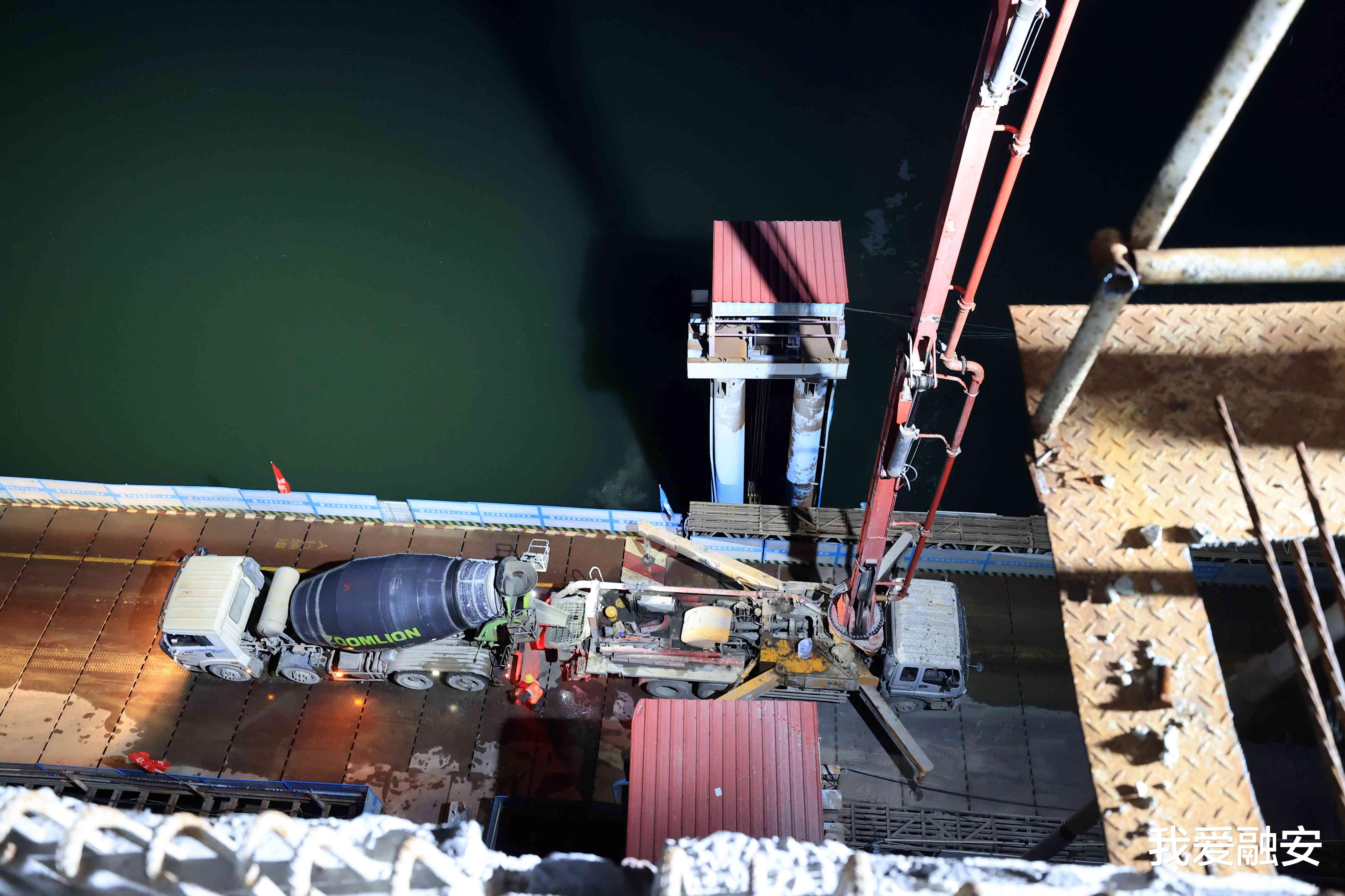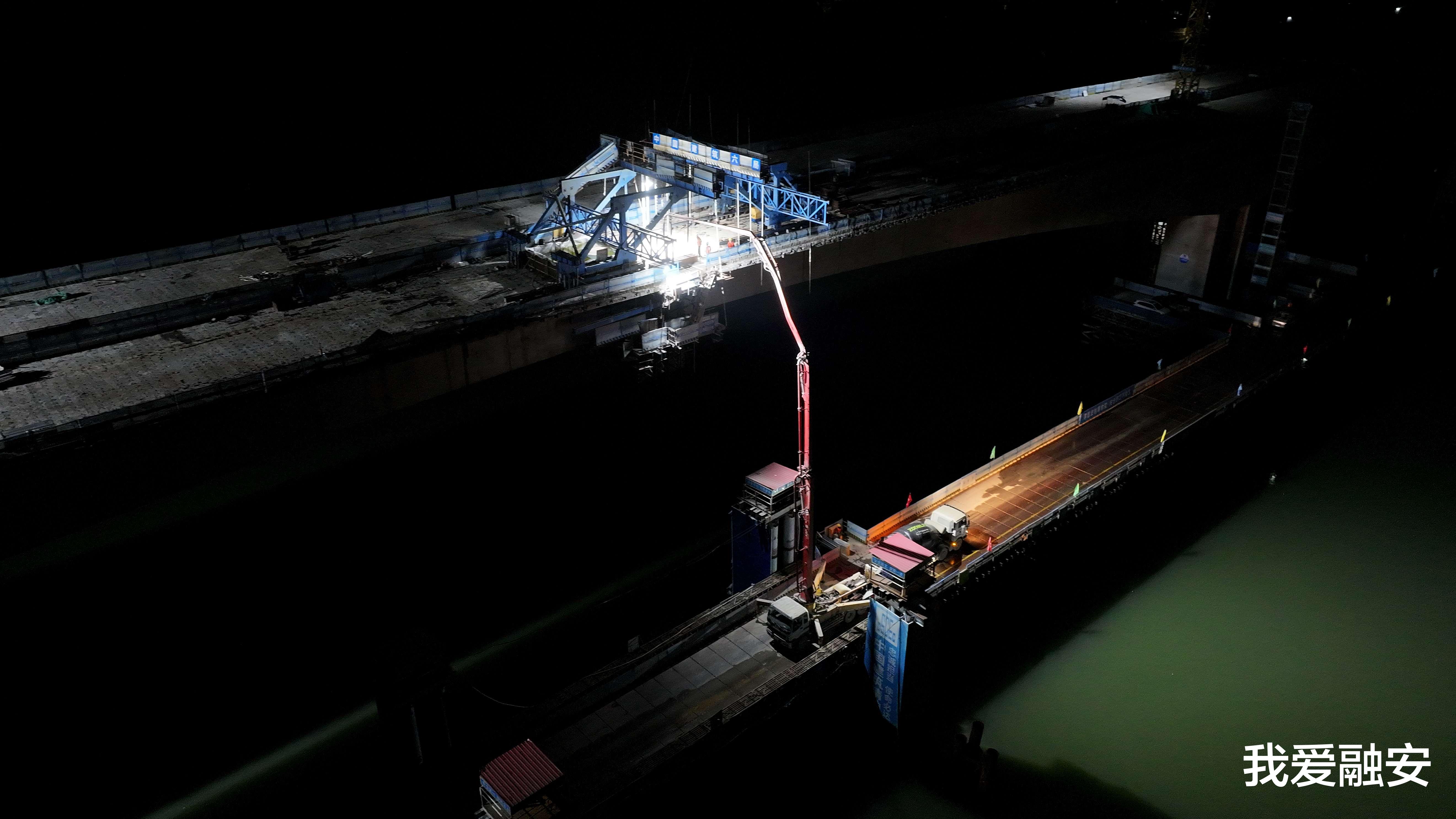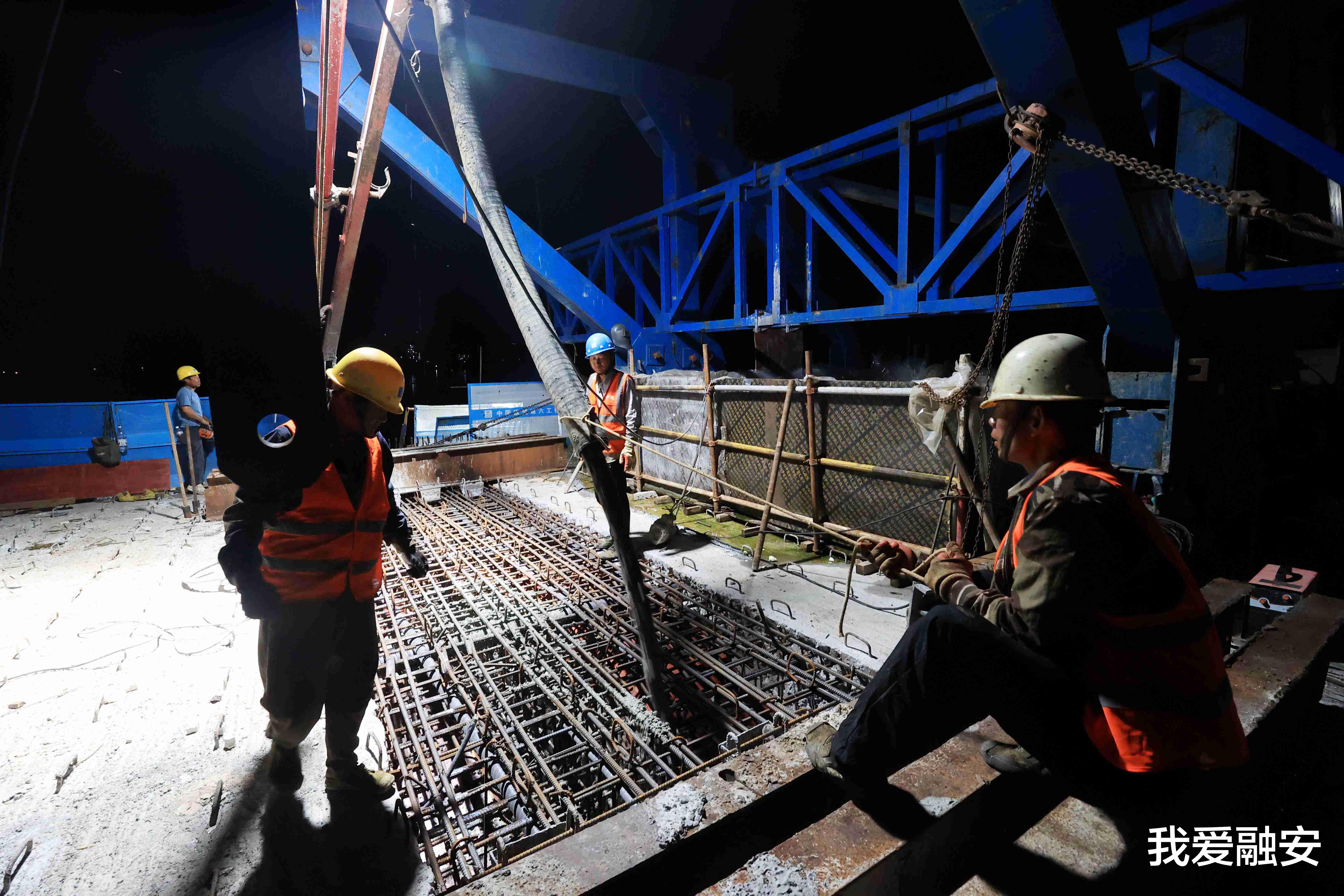 7月24日凌晨,广西中建融福高速融江特大桥建设工地,工人在进行混凝土浇筑作业。(谭凯兴 摄)