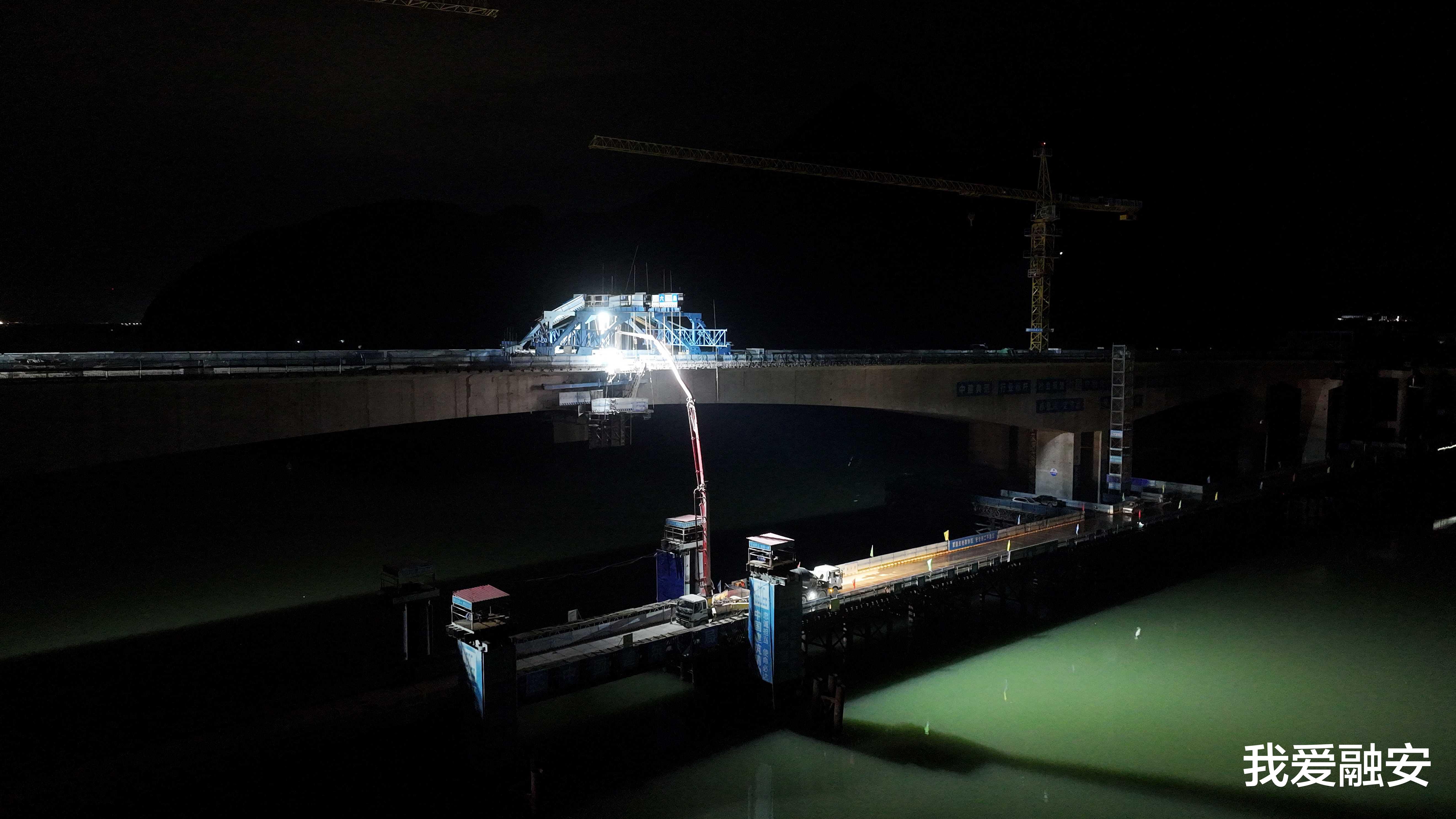 7月24日凌晨,广西中建融福高速融江特大桥建设工地,工人在施工作业。(谭凯兴 摄)
