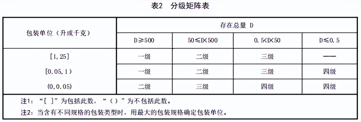 危险化学品试剂使用单位可通过减小危险化学品试剂包装规格,降低风险等级。根据危险化学品试剂存在总量、包装规格,形成风险分级矩阵,见下表2: