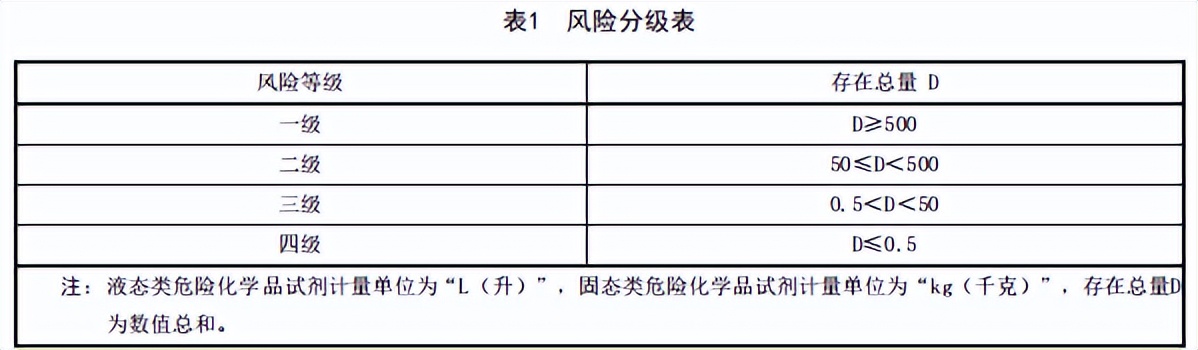 根据实验室危险化学品试剂的存在总量(D),划分风险等级,风险分级见下表1: