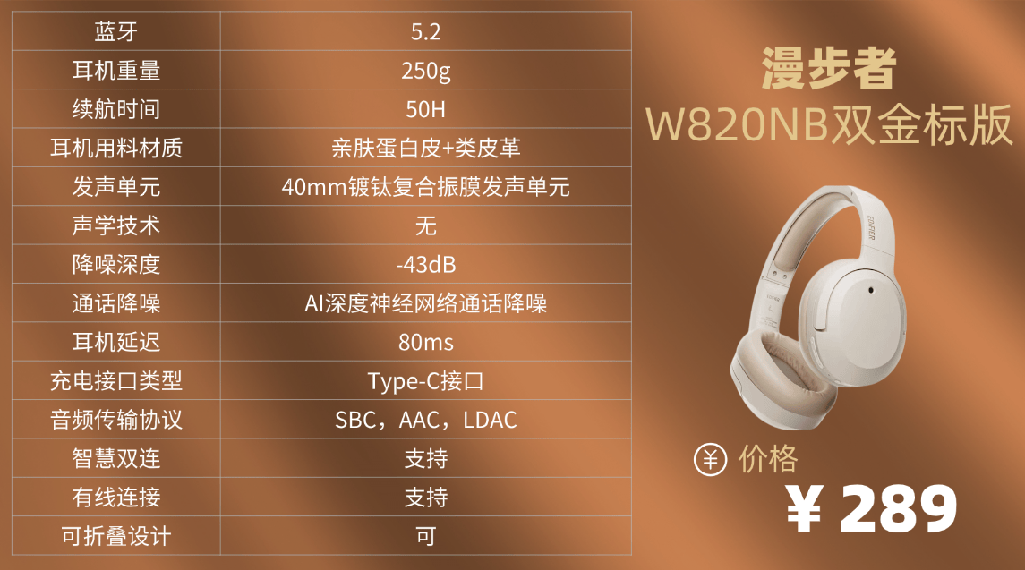 ②漫 步 者W820NB双金标版头戴式降噪耳机