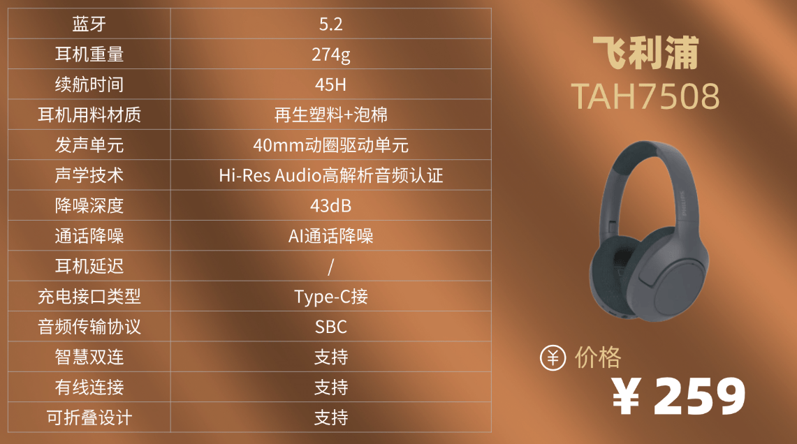 ⑤飞 利 浦TAH7508头戴式降噪耳机