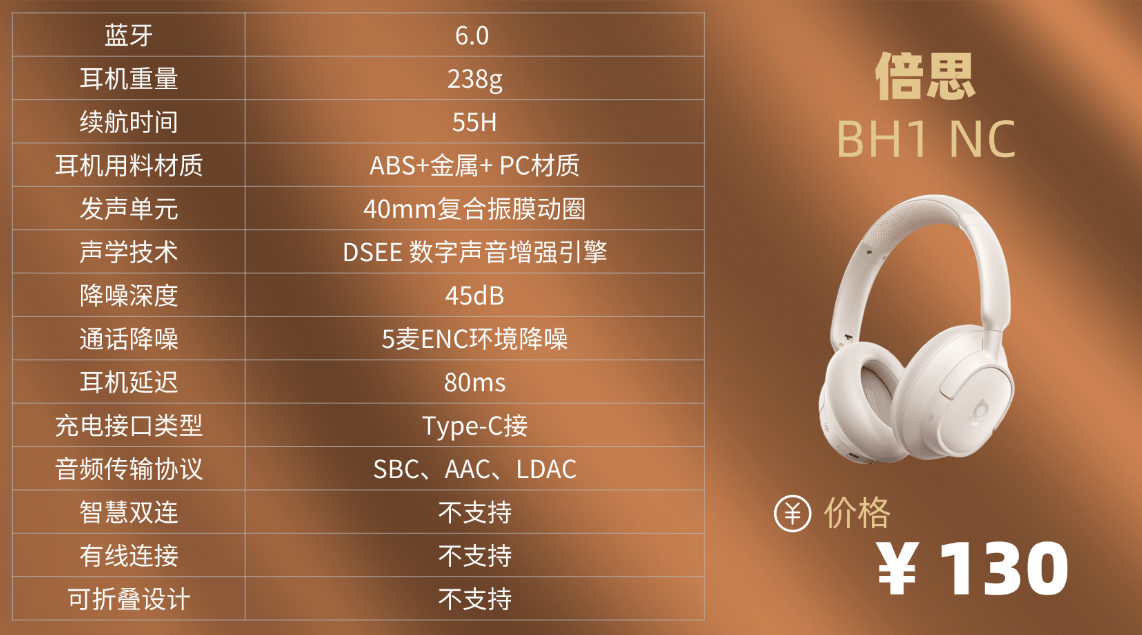 这款耳机的混合主动降噪实测深度标注为- 45dB,能对地铁、飞机等低频噪音起到一定削弱作用,通勤或办公时能感受到环境噪音有所降低。通透模式可实现不摘耳机听外界声音,日常使用基本能满足需求。佩戴上,238g的重量处于常规水平,头梁有一定柔韧度,耳罩触感柔软,长时间佩戴多数人不会有明显压头或夹耳感,仅头型偏大的人初戴时会觉得稍紧。蓝牙6.0连接表现稳定,支持SBC、AAC、LDAC三种编解码,能兼容多设备且实现双连接,切换过程较为顺畅。