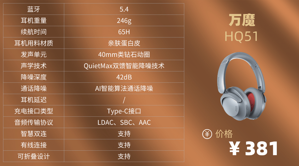 音质方面,耳机采用了40mm类钻石动圈,通过了Hi-Res小金标认证,支持LDAC高清音频传输。整体调音风格偏均衡路线,人声清晰靠前,低频有弹性但稍微有点轰头,中高频延展自然。蓝牙连接稳定,支持双设备无缝切换;续航表现也很亮眼,开启降噪可达35小时,关闭可超过50小时。蓝牙5.4使得在连接的时候比较快速,也不会出现断连的情况。