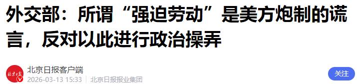 外交部:所谓“强迫劳动”是美方炮制的谎言,反对以此进行政治操弄