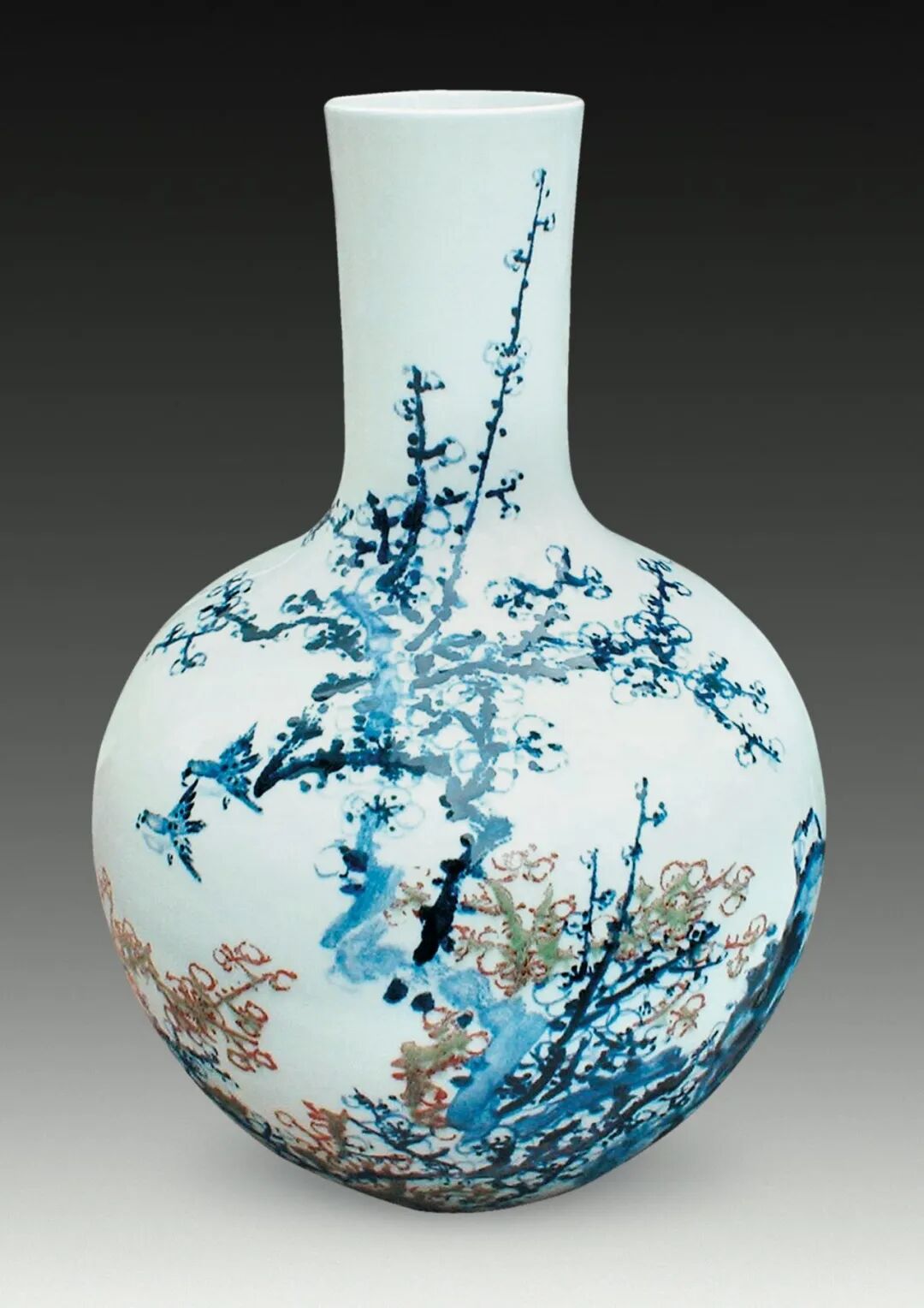 “以坚实的书法用笔,写瓷上的君子之花。”