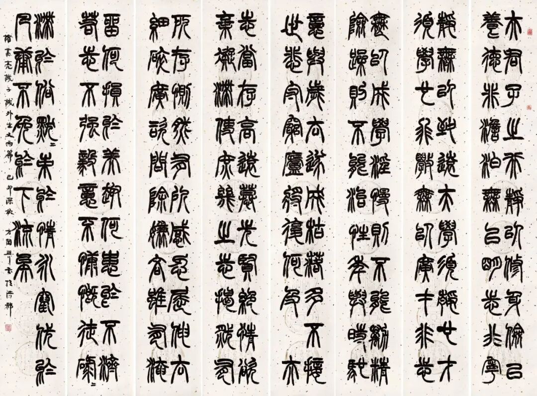 方先生学书善以隶笔为篆,兼收行书笔意;以篆笔为隶,兼取北碑用笔,同时又以篆隶北碑书法作行草,熔诸体于一炉,别启新图,自创面目。