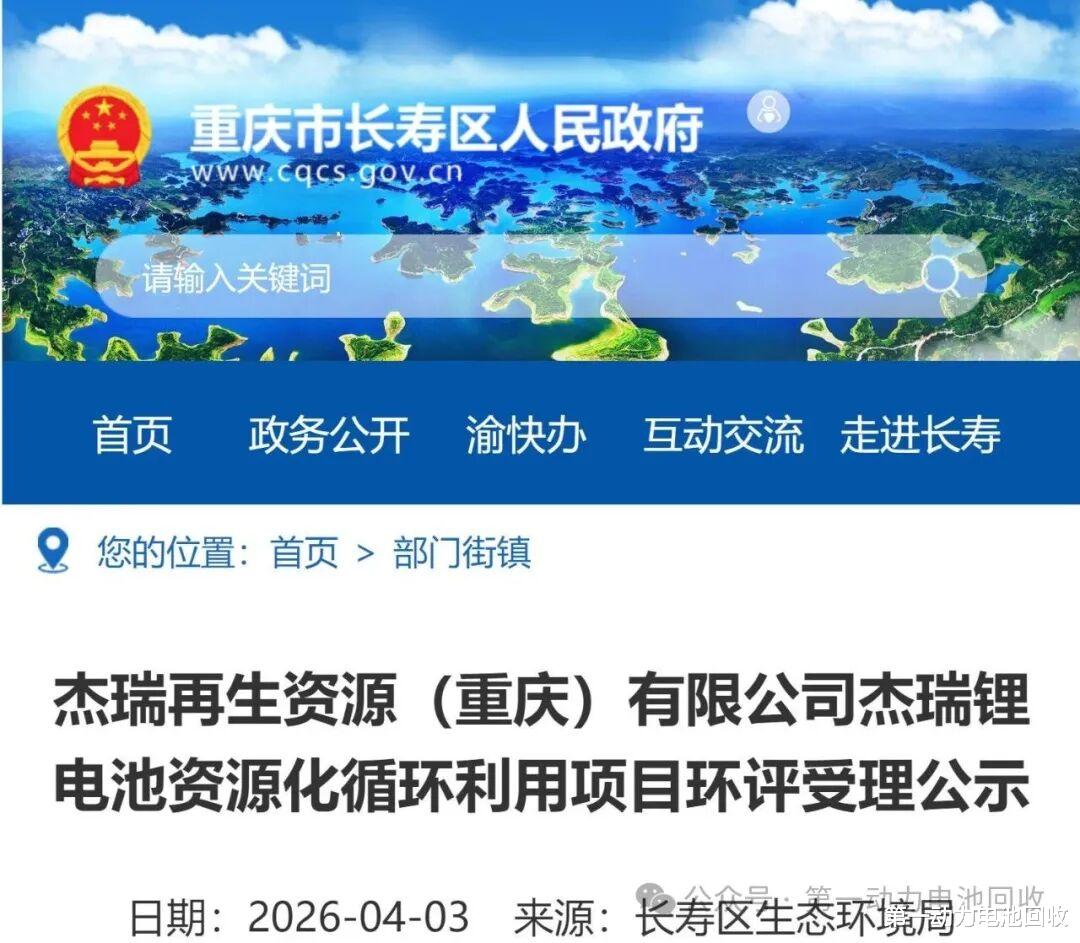 第一动力电池回收消息,近日,重庆市长寿区人民政府发布了《杰瑞再生资源(重庆)有限公司杰瑞锂电池资源化循环利用项目》环评受理公示。