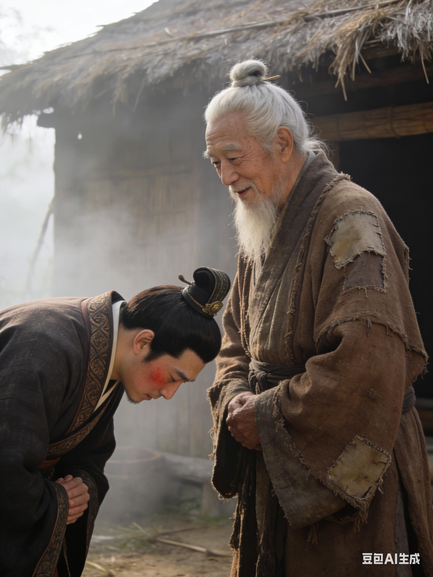 清晨的茅舍前,士成绮缓步走近,躬身深深一揖yī,姿态谦卑,再无半分昨日的狂傲。