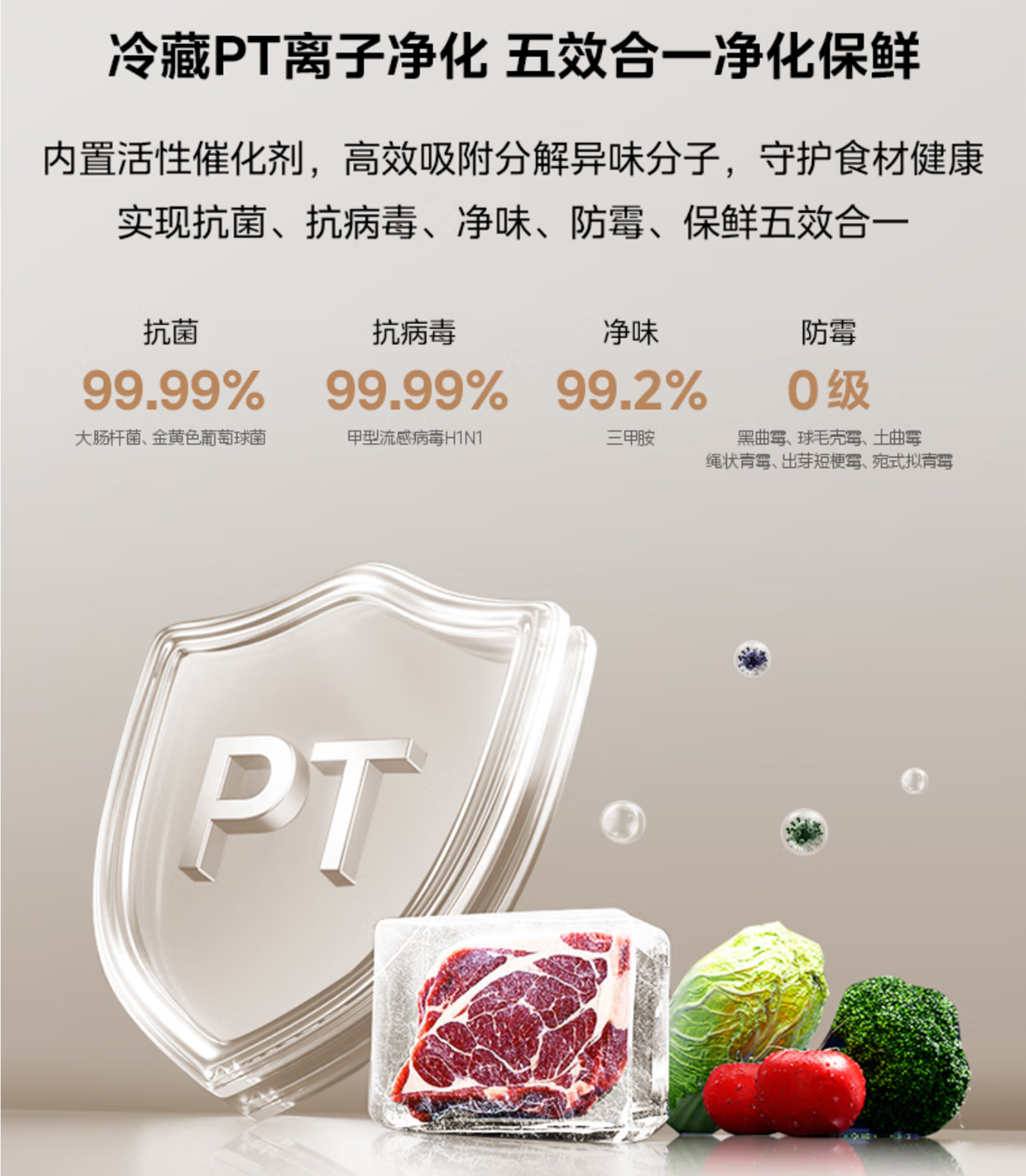 ③离子净(AI负离子高能除菌净味系统),释放 3000万+/cm³ 高浓度负离子,实现 七重功效:除菌、病毒灭活,去除异味、乙烯、农残,防霉,杀菌率达 99.9%,获中国家用电器研究院认证