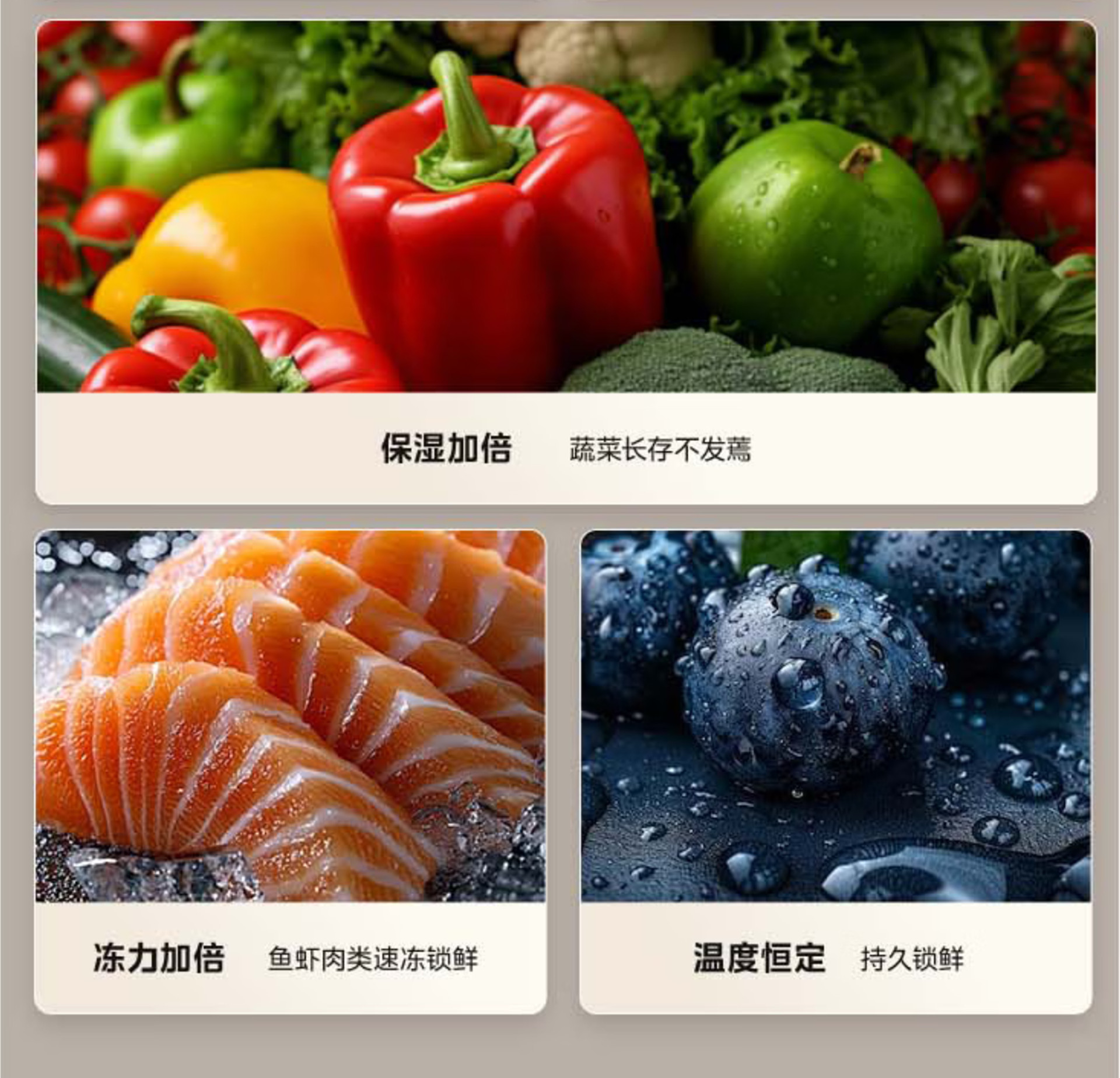 ② 水润鲜(智慧动态水雾保湿系统),维持冷藏室 70%黄金湿度,通过微米级水分子团精准补水,有效防止果蔬失水萎蔫,保持饱满口感与水分 。