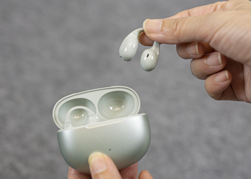单只耳机重量控制得当,耳挂使用柔性材料,贴合时顺着耳廓自然展开,不会产生明显的顶压感。与皮肤接触的区域做了细腻的表面处理,长时间佩戴下也不容易出现闷热或摩擦不适。在通勤、办公或轻度运动中,整体稳定性表现扎实;遇到跑跳幅度较大的动作时,耳机会有轻微晃动,但通过简单调整即可恢复稳固。整体属于不挑人、适合久戴的类型,更偏向日常使用友好型设计。