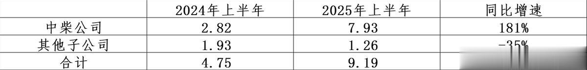 净利润方面,中柴公司的半年度净利润15.3亿元,同比增加181%。按照51.85%的持股比例计算,中柴公司对中国动力归母净利润的贡献值为7.93亿元,占比约为86.3%。同样,我们可以算出其他子公司2025年和2024年半年度净利润,除了中柴公司外的其他子公司半年度利润同比增速约为-35%。