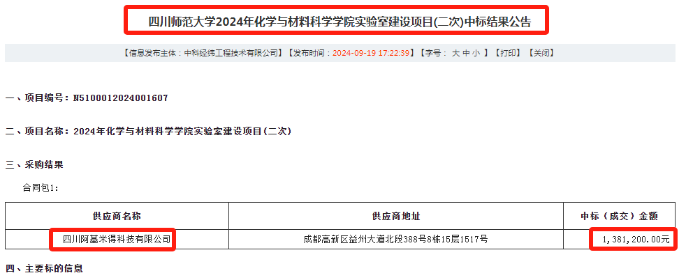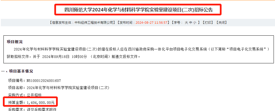 2024年8月27日,中科经纬工程技术有限公司受采购人——四川师范大学委托,发布《2024年化学与材料科学学院实验室建设项目(二次)招标公告》,预算金额为1404000元。