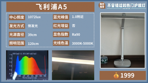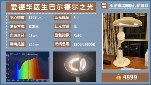 在光线光面,设计了防眩辅助光源,通过双光源配合有效减少明暗对比,降低长时间用眼时的视觉疲劳感;不过显色指数为Ra90,在色彩还原精准度上稍显不足,而且有害蓝光峰值也在1.0附近,整体的护眼效果在同价位中稍显一般。