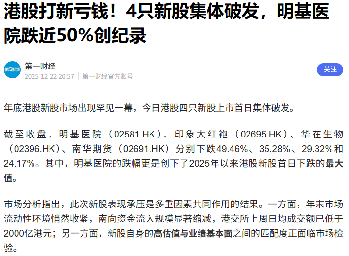 第一财经据choice数据梳理,2025年12月上市的17家新股中,共有9家新股首日出现破发,占比超一半。这与贯穿2025年大部分时间的新股强劲表现形成了鲜明对比。在年内上市的102只新股中,截至统计日股价上涨(含持平)的公司达76家,占比接近75%,其中16只个股累计涨幅超过100%。