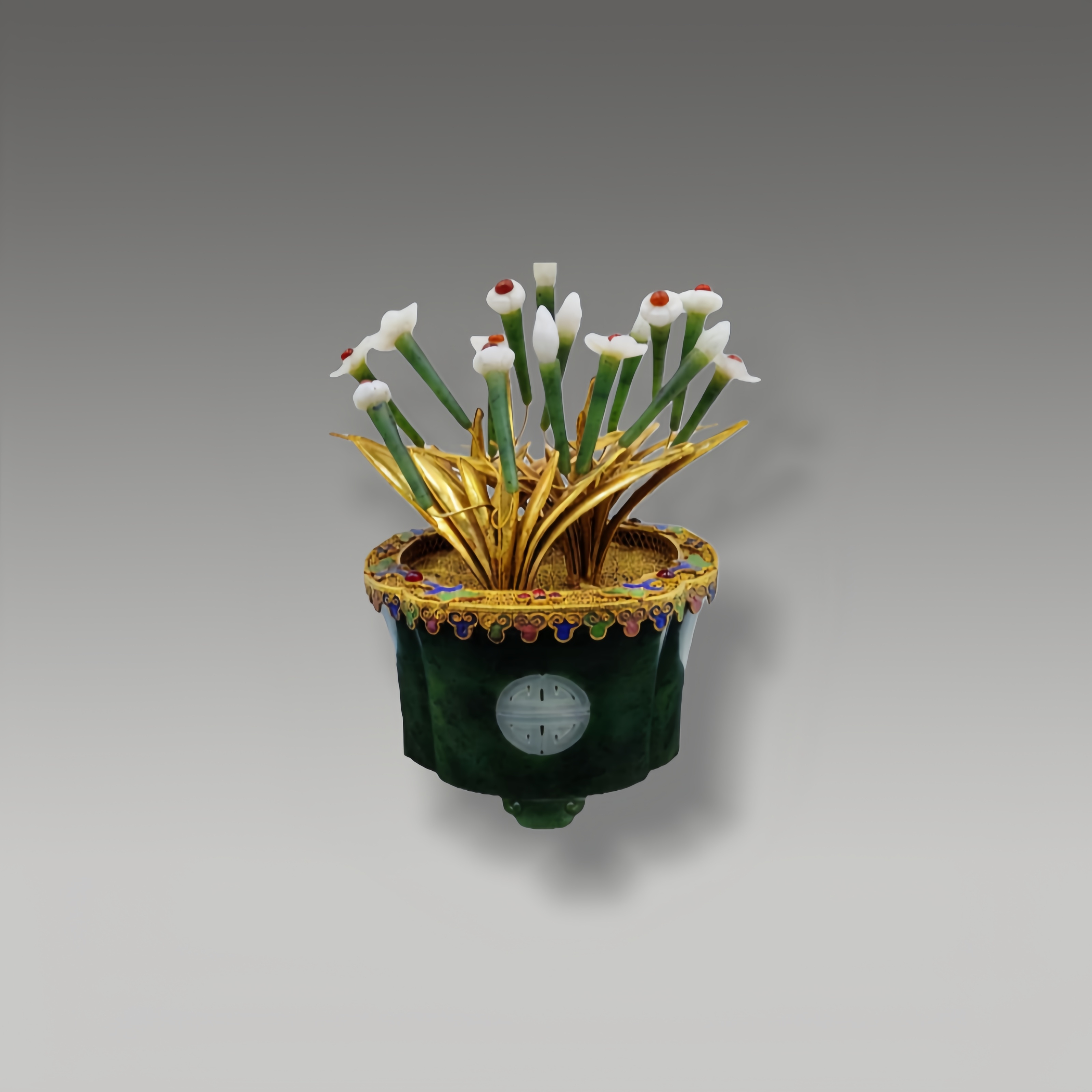 玉质凝润苍翠,嵌玉饰纹精巧,鎏金花枝搭配玉石花蕊,花丝珐琅镶边华丽,整器工艺繁复却浑然天成