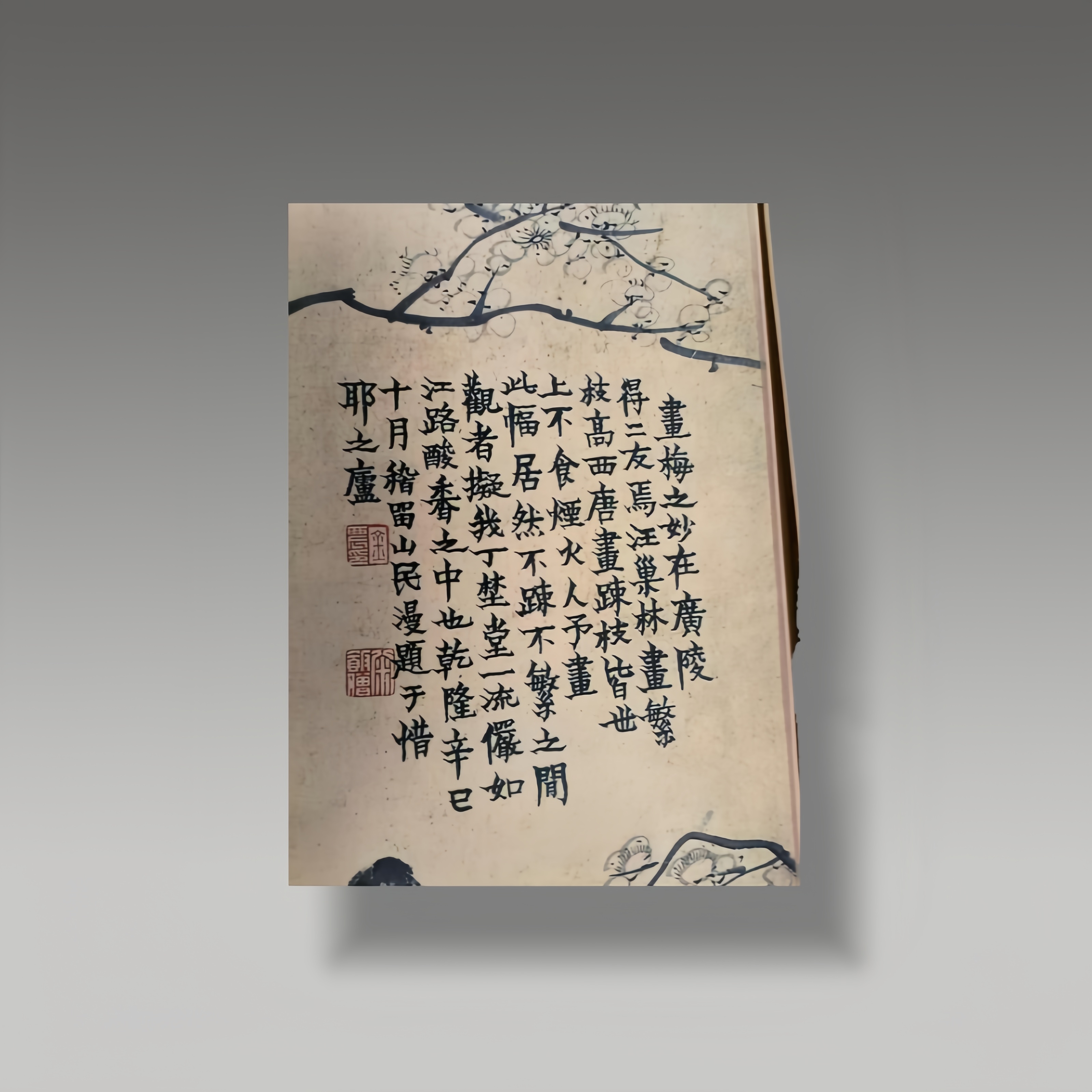 梅枝苍劲如铁,花绽疏朗含韵,题字朴拙藏锋,联语衬得清骨愈显。笔意写意见真趣,墨色浓淡皆通神