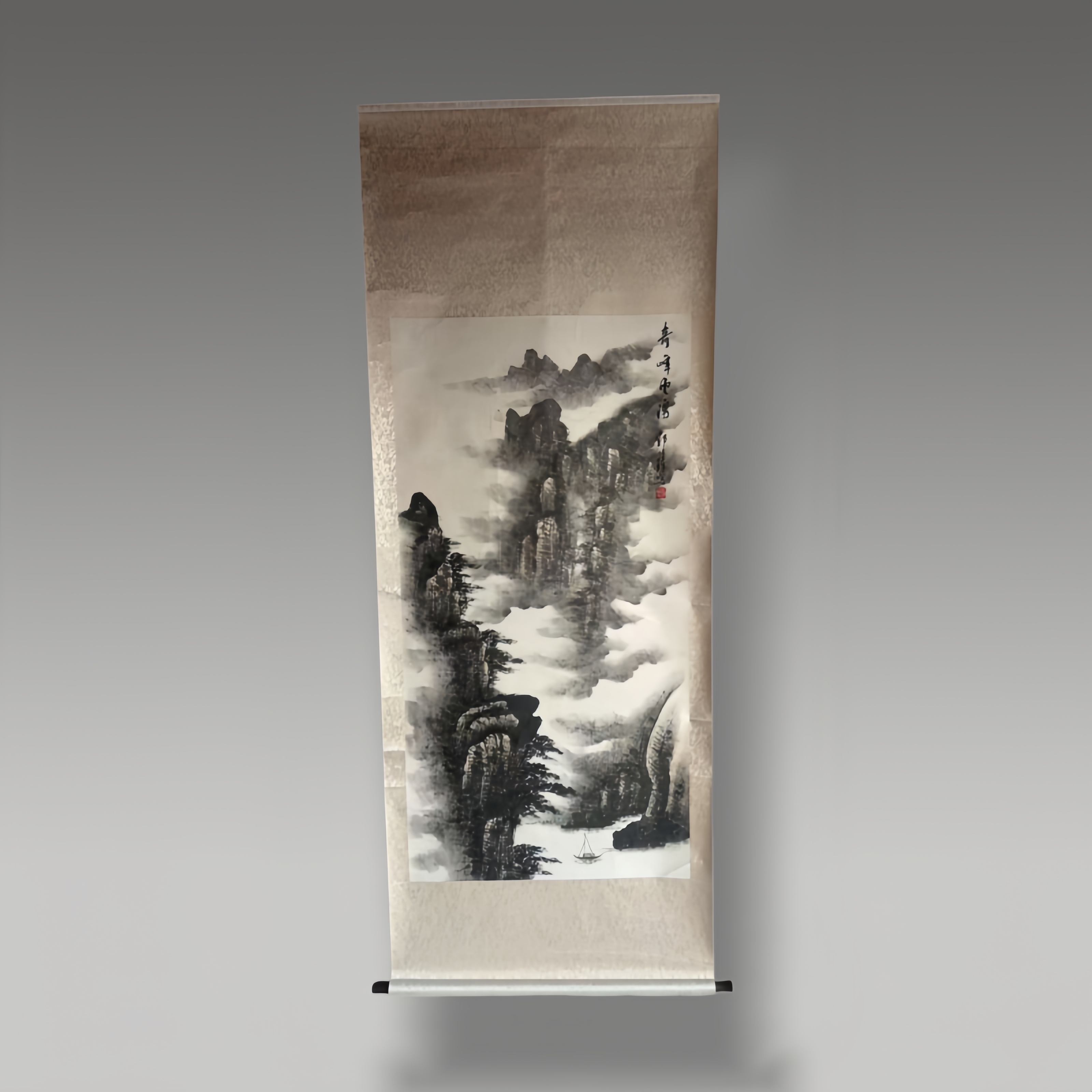 《奇峰云涌》水墨山水以浓淡墨绘险峰、流云、孤舟,笔力雄健,云雾氤氲间见意境空灵,是其写意山水典型之作