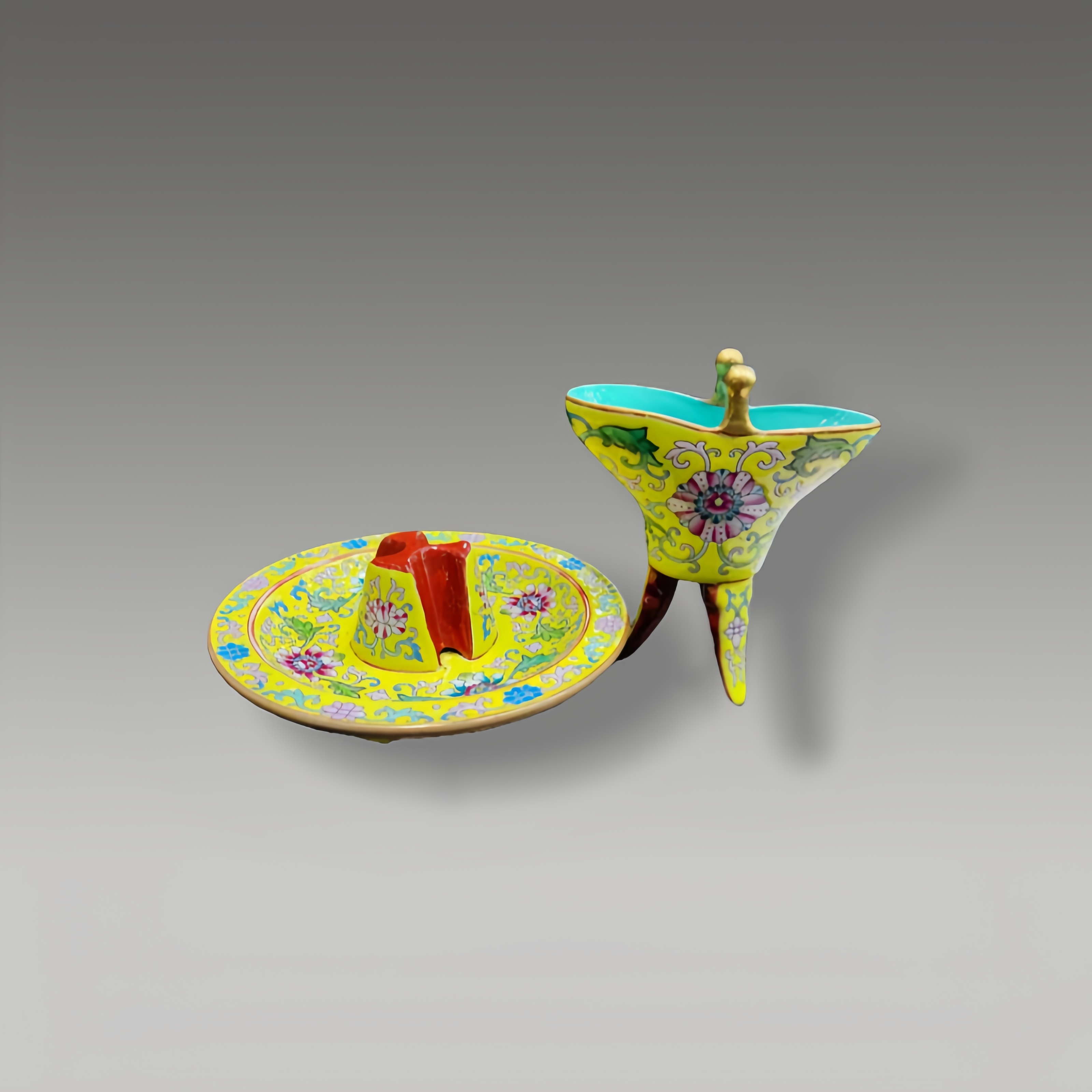 明黄地衬缠枝繁花,描金勾边华彩熠熠,杯身三足挺拔,胎质莹润,纹饰繁而不俗,尽显工艺之精妙
