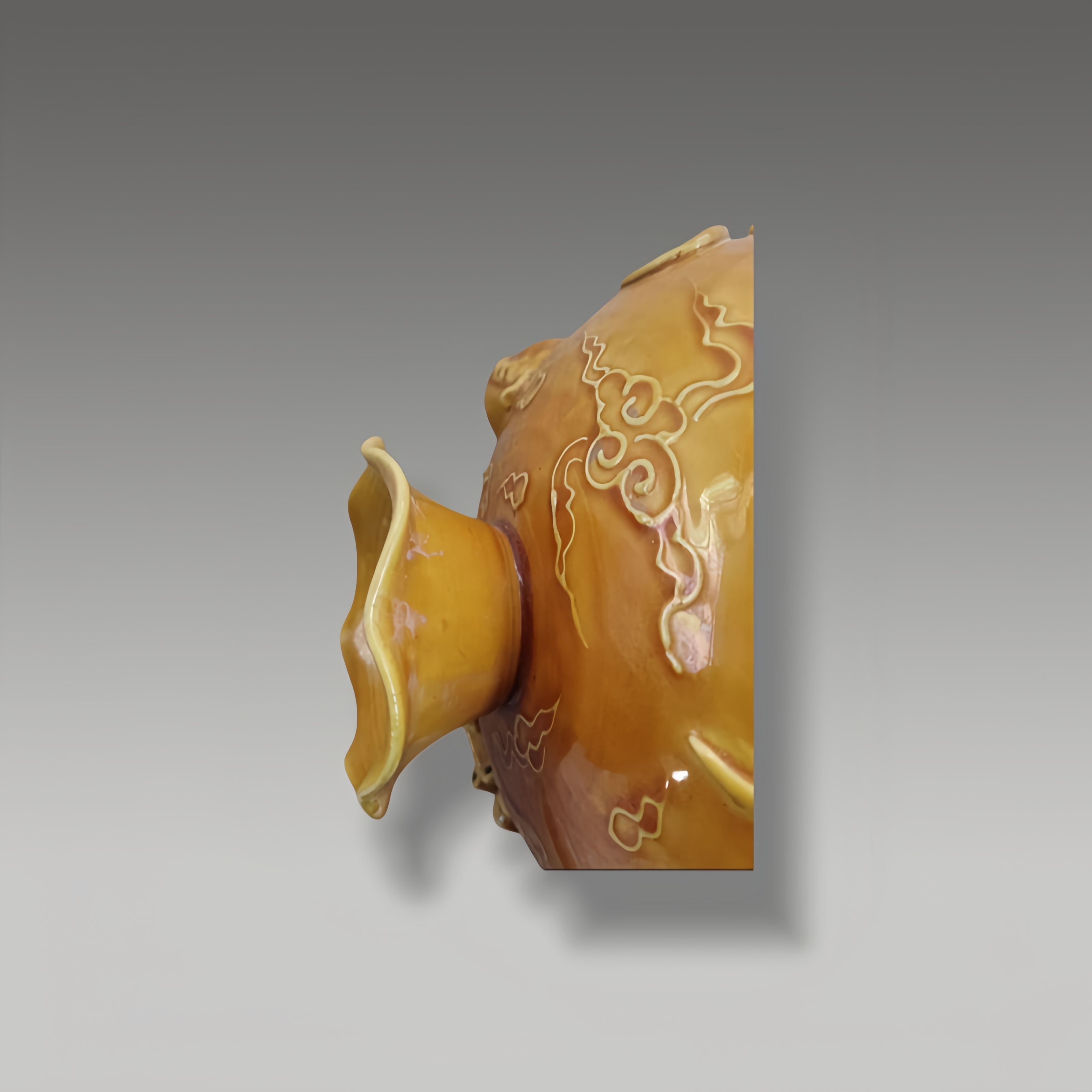 釉色明丽如鎏金,浮雕龙纹矫健灵动,云纹衬得龙姿更具气势,器型饱满端庄,雕工细腻精巧,一眼便见工艺之美