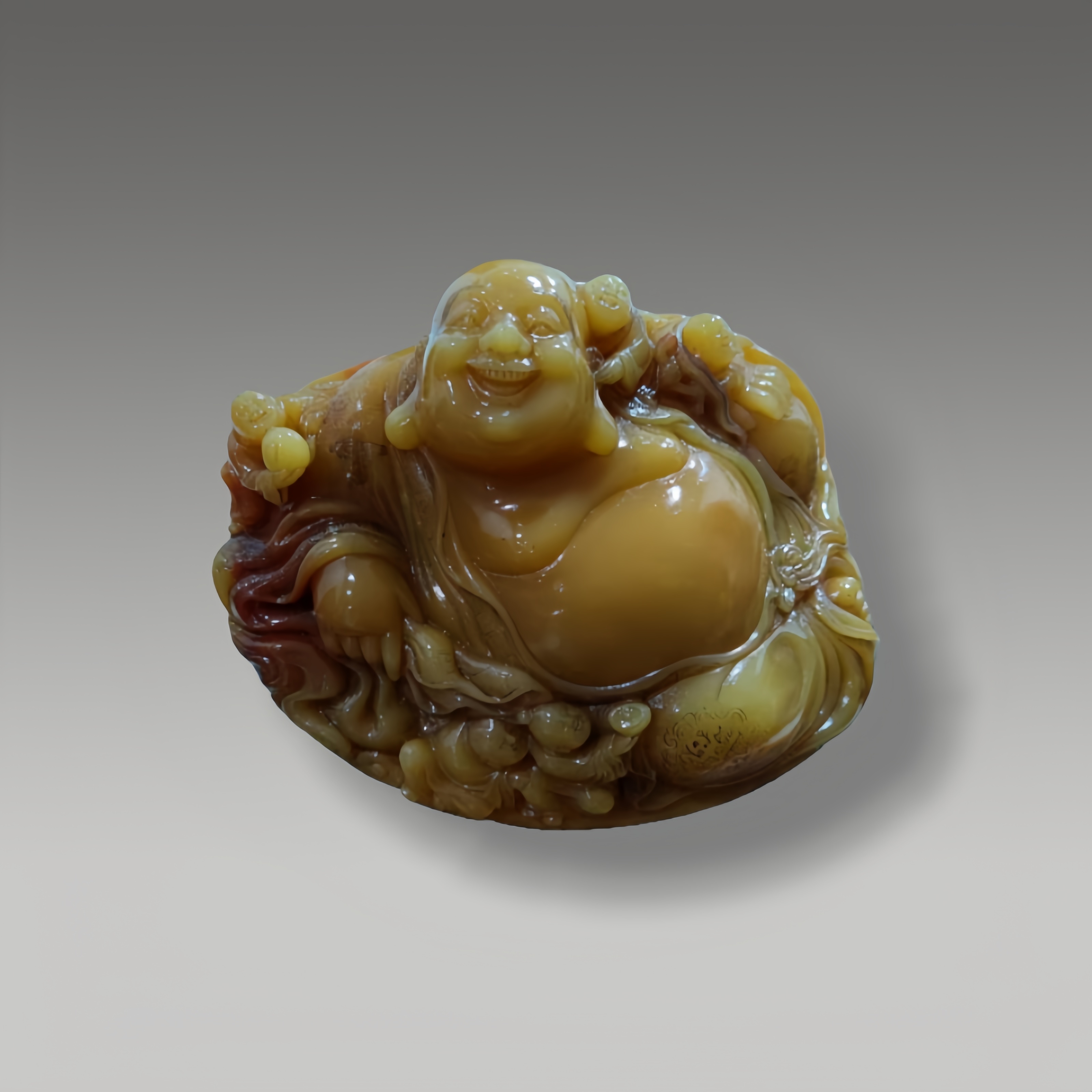 凝润如蜜蜡,弥勒笑貌憨态可掬,体态丰腴饱满,周身雕纹细腻灵动,整器尽显祥瑞雍容之态