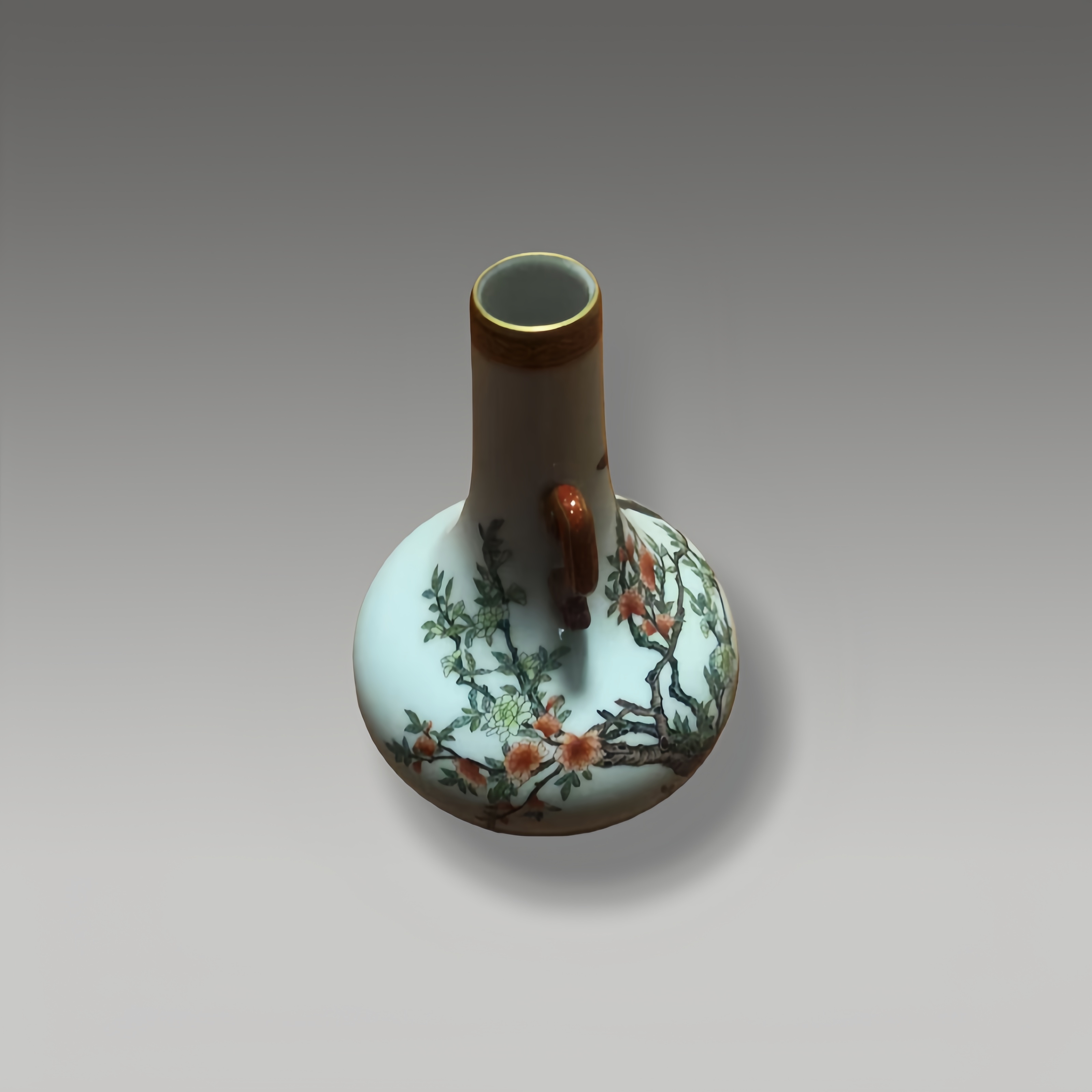 白瓷为底,粉彩绘花鸟枝蔓,红釉双耳描金点缀,雀鸟栖于花枝,构图疏密有致,尽显粉彩瓷绘的雅致与工细之美